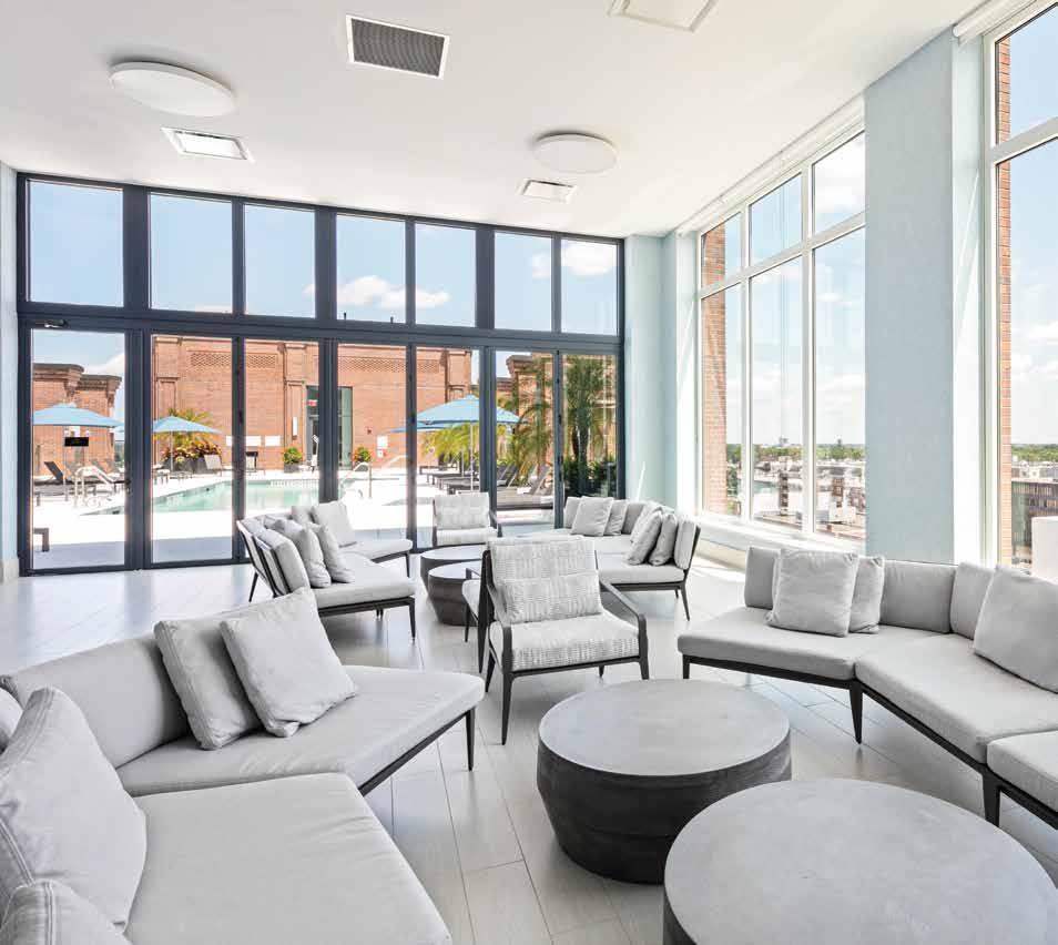 Morgan Parc’s courtyard is open to the public, not just to renters of its one- and two-bedroom apartments or users of its ground-floor retail. The formally designed space—with plantings, benches, a water feature, and a car drop-off—is the site of Mineola’s annual tree lighting ceremony. We were always thinking about how to integrate the town into our building,” says Slasky, “and our building into the town.”