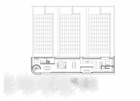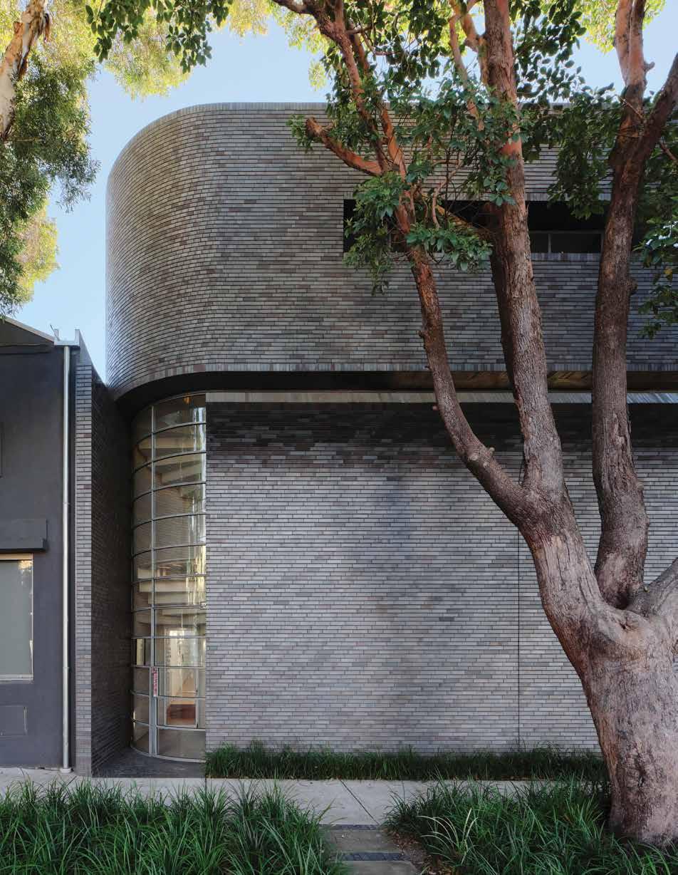 Behind this facade are ground-floor reception, second-floor break rooms, and a third-floor caretaker residence. Smart and his partner are, appropriately, the caretakers keeping watch on the building. The curve-filled design of the residence is dramatically different from that of the orthogonal office below. Smart says it responds to his studio’s philosophy of designing architecture from the inside out. “We try to think about the mood that we’re trying to create,” he says. “The mood for living is quite different from the mood for working.”