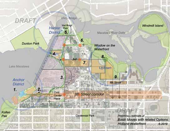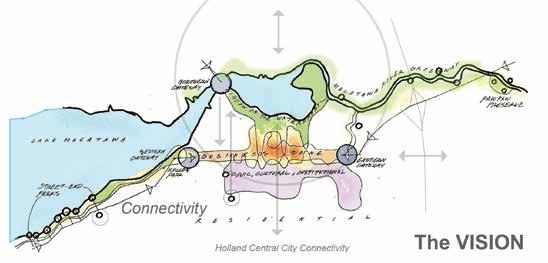 F IG . 33 : Framework diagram for the Downtown Waterfront Vision for Holland, MI highlighting the key opportunities for connectivity, redevelopment, and the strengthening the Community’s waterfront.