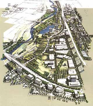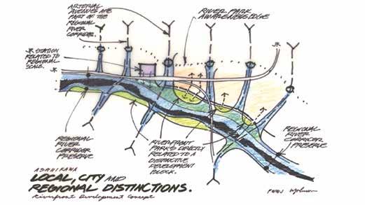 F IG . 55 : Sketch of an aerial view for the Asahikawa Downtown Riverfront Vision showing penetration and awareness of the riverfront system deeper into the city.
