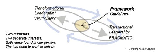 Just as vital is the second half of the process—the “Implementation” focus—which extends beyond the emphasis of the nine icons. A key message of this book is the call to bridge two different mindsets —the “transformational” (visionary) and “transactional” (pragmatic). That involves an intentional effort to meld the best of both approaches. These two types of leadership are noted by American presidential historian