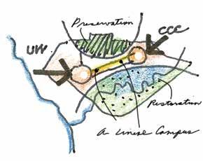 F IG . 32 : Framework diagram for the University of WashingtonCascadia Community College campus expansion developed after two years of exploration, and a momentous morning of discovery which led to this lineal campus concept.
