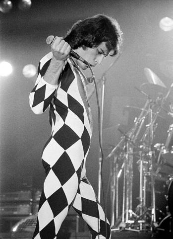 98 and 99 Two moments at the concert held at Copenhagen’s Broendby Hall on May 12th, 1977. Freddie Mercury is dressed in the harlequin suit inspired by the Russian ballet dancer Nijinsky. In 2015, the historic costume was sold at auction for $35,000.