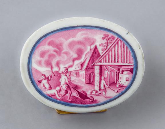 Ovalzylindrische Tabaksdose mit flachem Deckel und vergoldeter, profilierter Metallmontierung. Fein gemalte Purpurcamaieumotive in unterschiedlichen Rahmungen zieren die Außenseiten: Auf dem Deckel ist innerhalb eines einfachen blauen Rahmens eine Gruppe aus drei Bergoffizieren zu Pferd in einer Landschaft dargestellt. Während der linke Reiter mit einem vor ihm stehenden, als Rückenfigur gegebenen Bergmann kommuniziert, scheinen die beiden anderen Reiter miteinander im Gespräch zu sein. Vor einem weiteren Pferd ohne Reiter beugt sich ein Bergmann vor und hantiert mit einem Erztrog neben einem großen Holzbottich. Im Hintergrund sind am linken Bildrand vor einem Gebäude zwei weitere Reiter zu sehen.