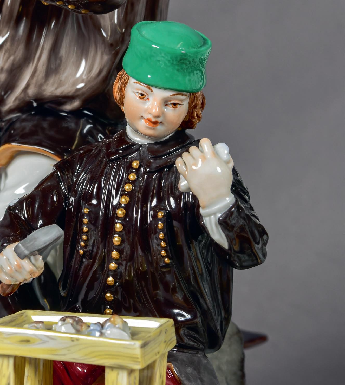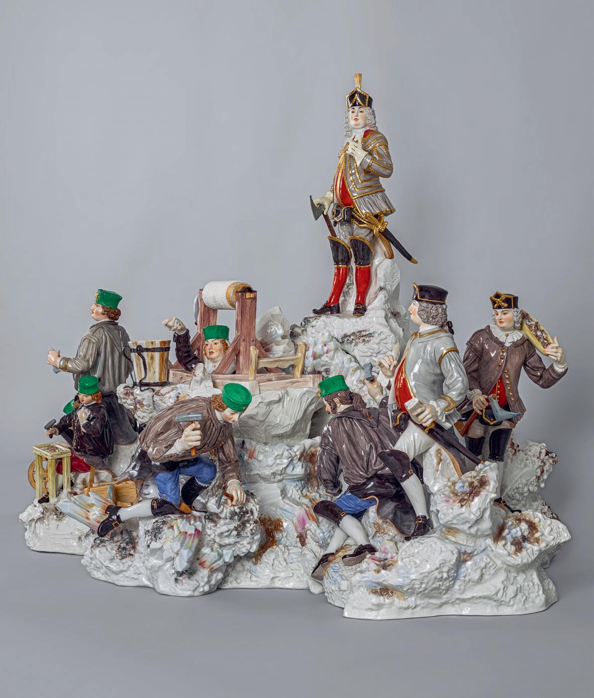 Figurenensembles wurden von den Meissener Modelleuren, besonders von Johann Joachim Kaendler und Michel Victor Acier (1736–1799), in nicht unerheblicher Anzahl für den sächsisch-polnischen Hof, für den Premierminister König Augusts III., Heinrich Graf von Brühl (1700–1763), und für die russische Zarin Katharina II. (1729–1796) geschaffen. Nicht immer dienten sie als Tafelaufsätze, sondern manchmal auch als Gruppen für die Präsentation auf Konsolen, so beispielsweise im Porzellankabinett der Zarin im Palais an den Rodelbergen des Gartens von Schloss Oranienbaum bei St. Petersburg. Das vorliegende Stück, das ein stilisiertes Bergwerk zeigt, trägt ganz eindeutig und unverkennbar die Handschrift des