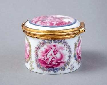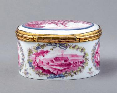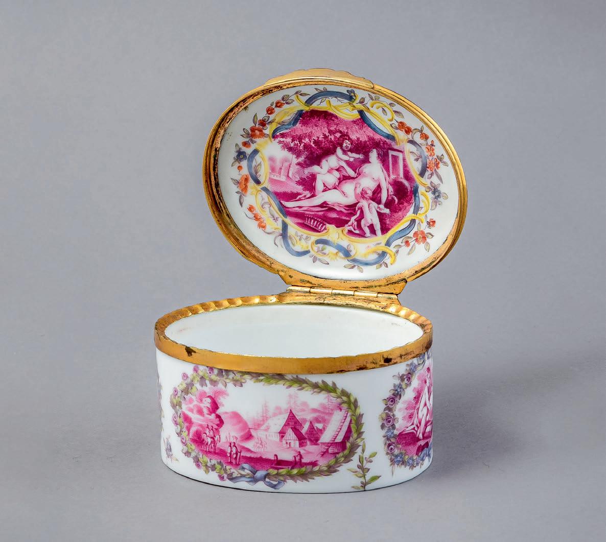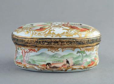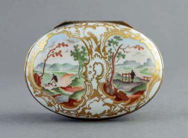 Ovale Tabaksdose mit flach gewölbtem Deckel, konkav eingezogenem Korpus und abgesetztem Boden. Die Oberfläche zieren flache Reliefrocaillen, die Bildkartuschen umrahmen. Deckel und Korpus sind mit einer ziselierten Metallfassung verbunden.