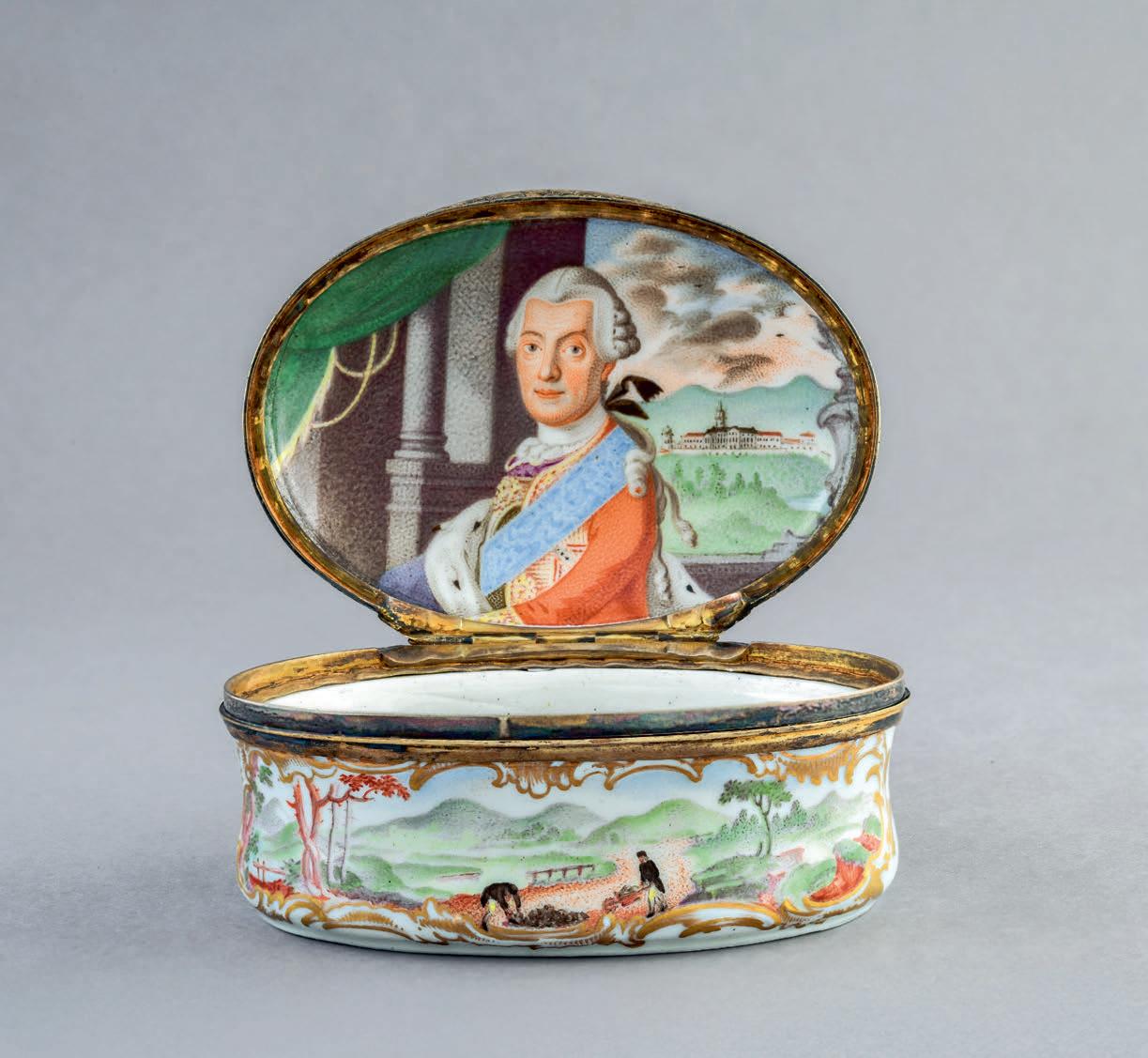 Besonders aufwändig ist die Deckelinnenseite bemalt. Als Halbfigur in Dreiviertelansicht von links ist in der Bildmitte Fürst Ludwig Günther II. von Schwarzburg-Rudolstadt (1708–1790) zu sehen. Bekleidet ist er mit einem reich bestickten, eisenroten Gehrock über einem Kürass, einem rüschenbesetzten Hemd und Halsbinde, über die linke Schulter ist eine breite blaue Moiréschärpe gelegt. Über den rechten, nicht sichtbaren Arm ist ein violetter, mit Hermelin gefütterter und verbrämter Mantel gelegt. Den Kopf bedeckt eine graue, gescheitelte Perücke mit Seitenlocken, und langem, im Nacken mit einer schwarzen Schleife gebundenen Zopf, wovon einzelne, gelockte Strähnen auf die linke Schulter und den Rücken hinab fallen. Der Portraitierte ist vor eine angeschnittene Architekturkulisse gesetzt, die links durch eine auf einen Mauervorsprung gestellte Säule ausgezeichnet ist. Eine grüne Draperie mit Fransen- und Kordelbesatz begrenzt den Bildrand oben links. Auf der rechten Seite ist der Blick durch eine Maueröffnung in eine Landschaft gegeben. Dort ist vor einer Gebirgskette unter einem Himmel mit dunkelgrauen Wolken vor zarter Röte eine Ansicht von Schloss Heidecksburg zu sehen. Am rechten Bildrand ist eine auf die Mauerbrüstung gestellte Vase im Anschnitt zu sehen. Die Dose stammt aus der Sammlung der Fürsten von Thurn und Taxis und wurde früher entweder der Porzellanmanufaktur in Wien oder in Kelsterbach zugeschrieben. Das Portrait zeigt unzweifelhaft Ludwig Günther II. von Schwarzburg-Rudolstadt, gemalt nach dem Bildnis von Johann Ernst Heinsius (1731–1794) im Thüringer Landesmuseum Heidecksburg in Rudolstadt. Bergbau spielte in seinem Herrschaftsgebiet unter anderem am Kyffhäuser eine Rolle, wo Kupferschiefer abgebaut wurde, und im Schwarzatal im Thüringer Wald. Dort wurde in Sitzendorf Erz abgebaut, in Katzhütte befand sich eine Saigerhütte. Und noch bis 1774 versuchte man sich –erfolglos –in Goldisthal im Goldbergbau.