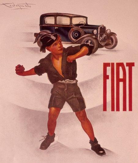 112 In the advertising poster for the FIAT 508 Balilla there is a boy in Fascist uniform ready to hurl a stone. The drawing pays homage to Giovan Battista Perasso, nicknamed Balilla, who, with a stone, set off the Genoa revolt against the Austrians in 1746. This FIAT model was presented at the 1932 Milan Motor Show, and it became the most popular for the Turin company. It covered 60 miles on only 2 US gallons of fuel.