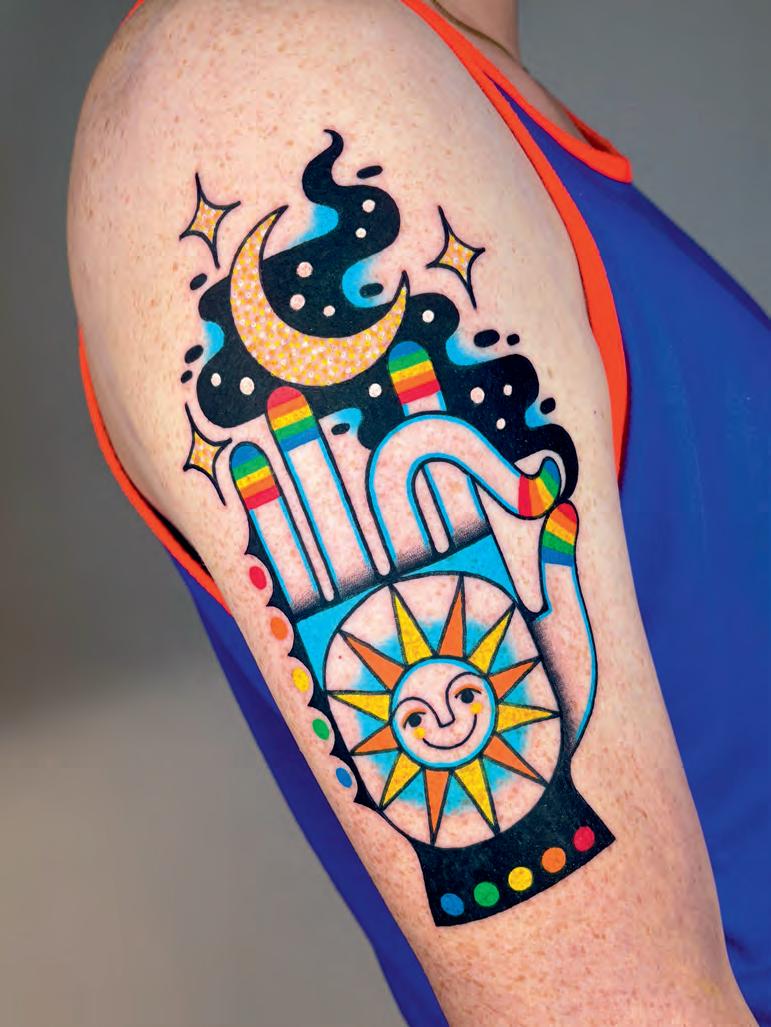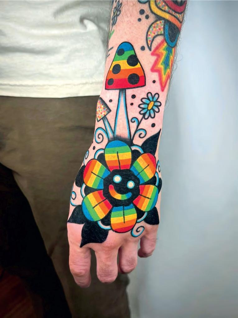 Based in Portland, Oregon, Winston the Whale is a tattoo artist at Dental Bonez Clubhouse, known for his bold, colourful designs with thick, striking lines. A lover of rainbow hues, he has a playful, eye-catching style that incorporates vibrant colour palettes and dynamic compositions into most of his work, aiming to create tattoos that radiate joy, fun and positivity.
