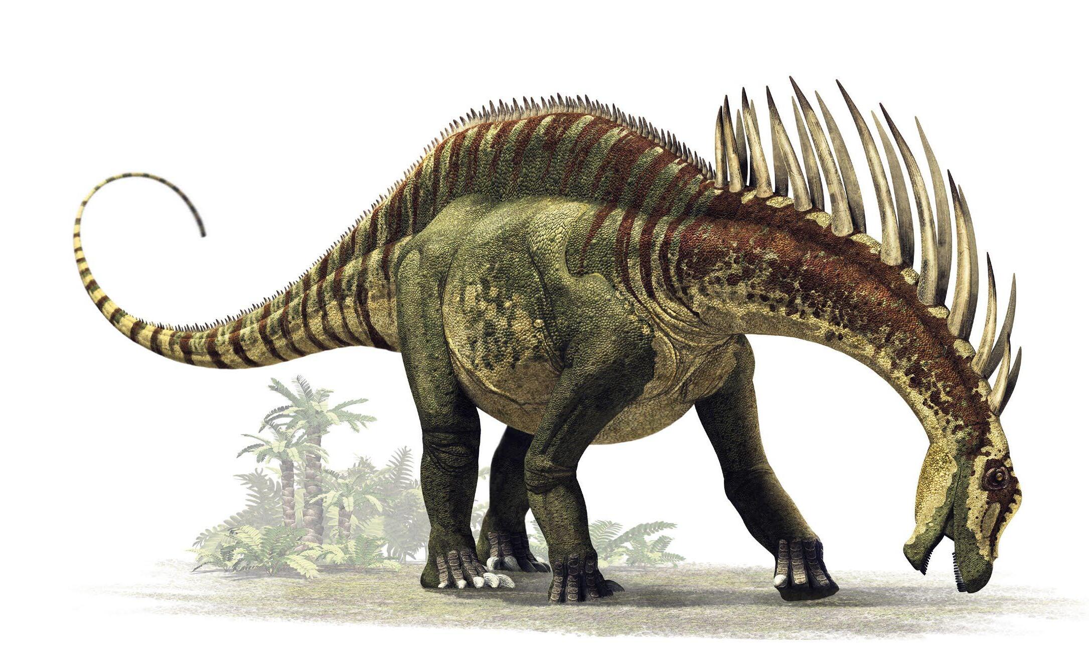 It was one of the most bizarrelooking dinosaurs. TWO ROWS OF BONY SPINES , as extensions of the dorsal vertebrae, ran in parallel along the top of its back, from its neck—where they were even more pronounced and could reach up to 1.6 ft (0.5 m) in height—to its tail. One of the theories about their function is that they worked as a weapon against predators, because they were COVERED IN HORNS . However not everyone agrees with this theory, as the position of the spines could only have offered a limited amount of defense. It would have been different if they had been distributed over the rest of its body. Given that ONLY THE MALES POSSESSED THEM , perhaps Amargasaurus used them to fight with rivals of its species during confrontations over females.