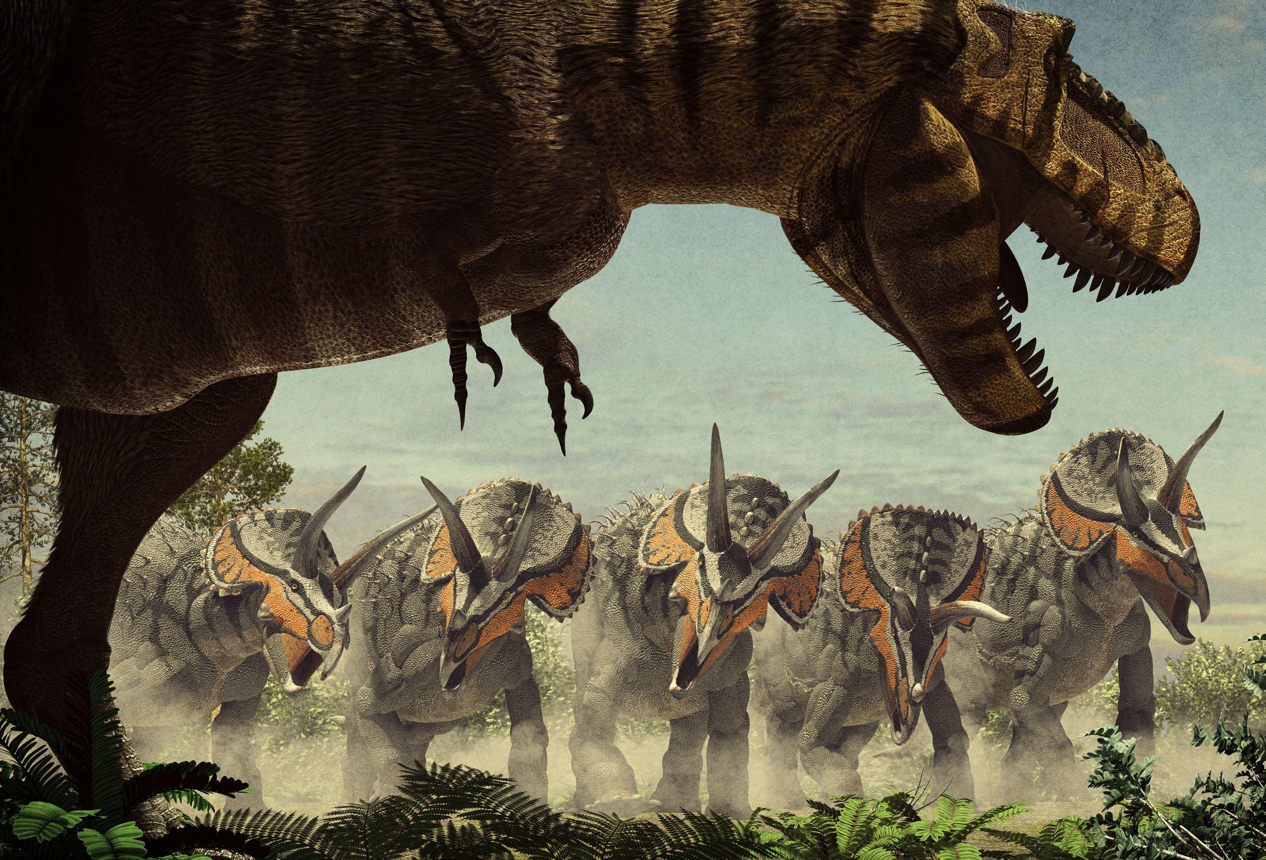 EVEN THOUGH SOME OF THE MOST WELL-KNOWN DINOSAURS ARE CARNIVORES, SUCH AS THE GIGANTIC AND FEARSOME T-REX, THERE ARE ALSO SOME “CELEBRITIES” AMONG THE HERBIVOROUS DINOSAURS . WITH ITS LARGE PLATES AND SPIKES-PACKED TAIL, STEGOSAURUS WAS ABLE TO INFLICT FATAL INJURIES ON THE MOST AGGRESSIVE PREDATORS. TRICERATOPS LOOKED LIKE A PROPER PREHISTORIC TANK, WITH ITS HORNS AND BONY FRILL. MAIASAURA WERE THOUGHTFUL MOTHERS, WHILE OURANOSAURUS WOULD FRIGHTEN ITS ENEMIES AND WIN OVER FEMALES DURING THE MATING SEASON, THANKS TO THE LONG SAIL ON ITS BACK.