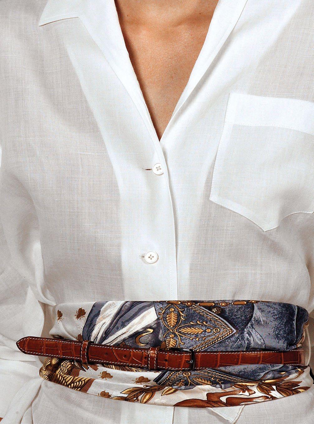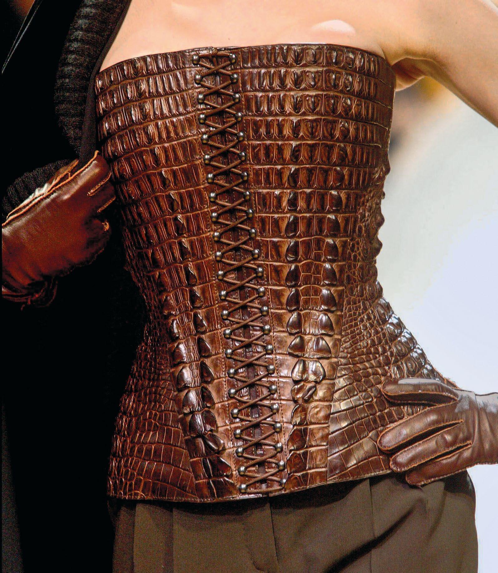 This page – Wearing a silk scarf as a belt was another one of the provocations of the enfant terrible of fashion for Hermès. Opposite page – Detail of a leather corset from the A/W 2004 collection by Hermès under Jean Paul Gaultier’s creative direction.