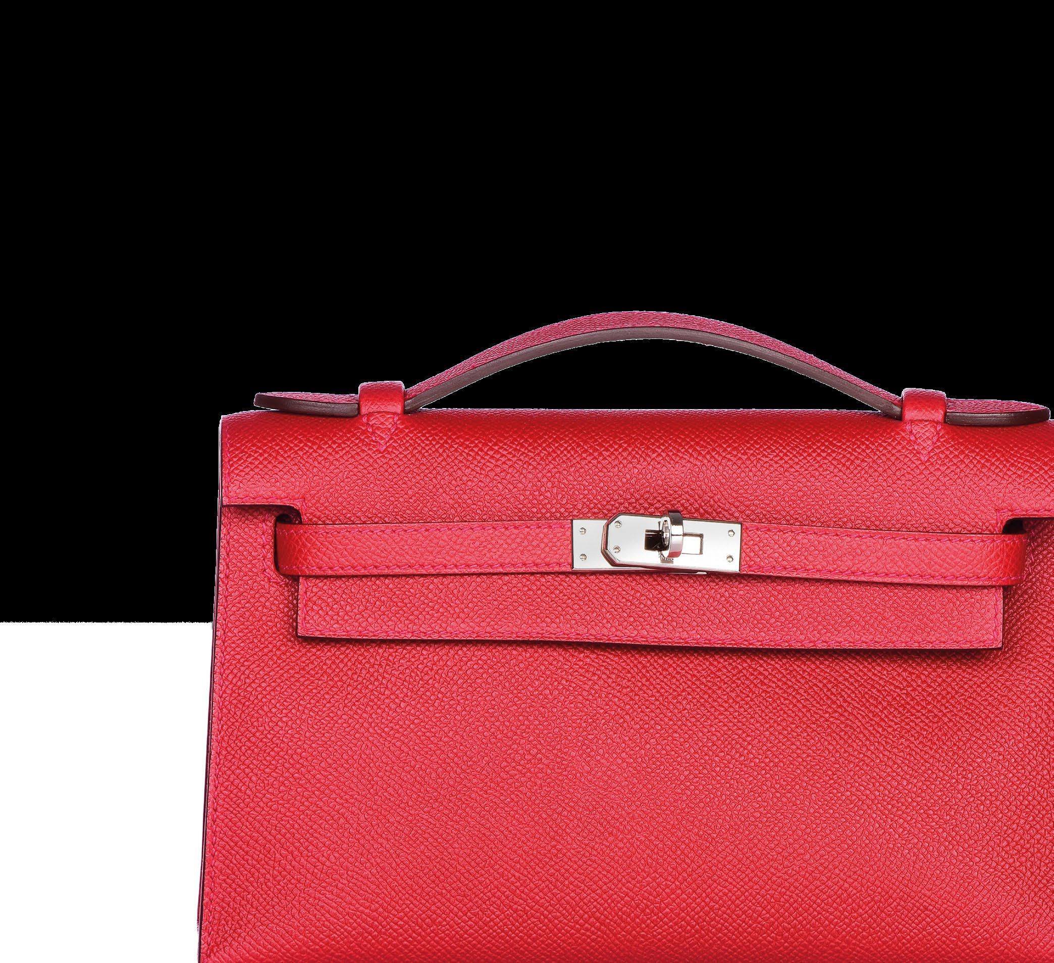 Opposite, bottom – Mini Kelly Pochette 22 in Epsom leather in Rouge Casaque with palladium hardware, 2016. The Kelly Pochette has a lock and clasp closure like the original Kelly, but it has a short top handle.