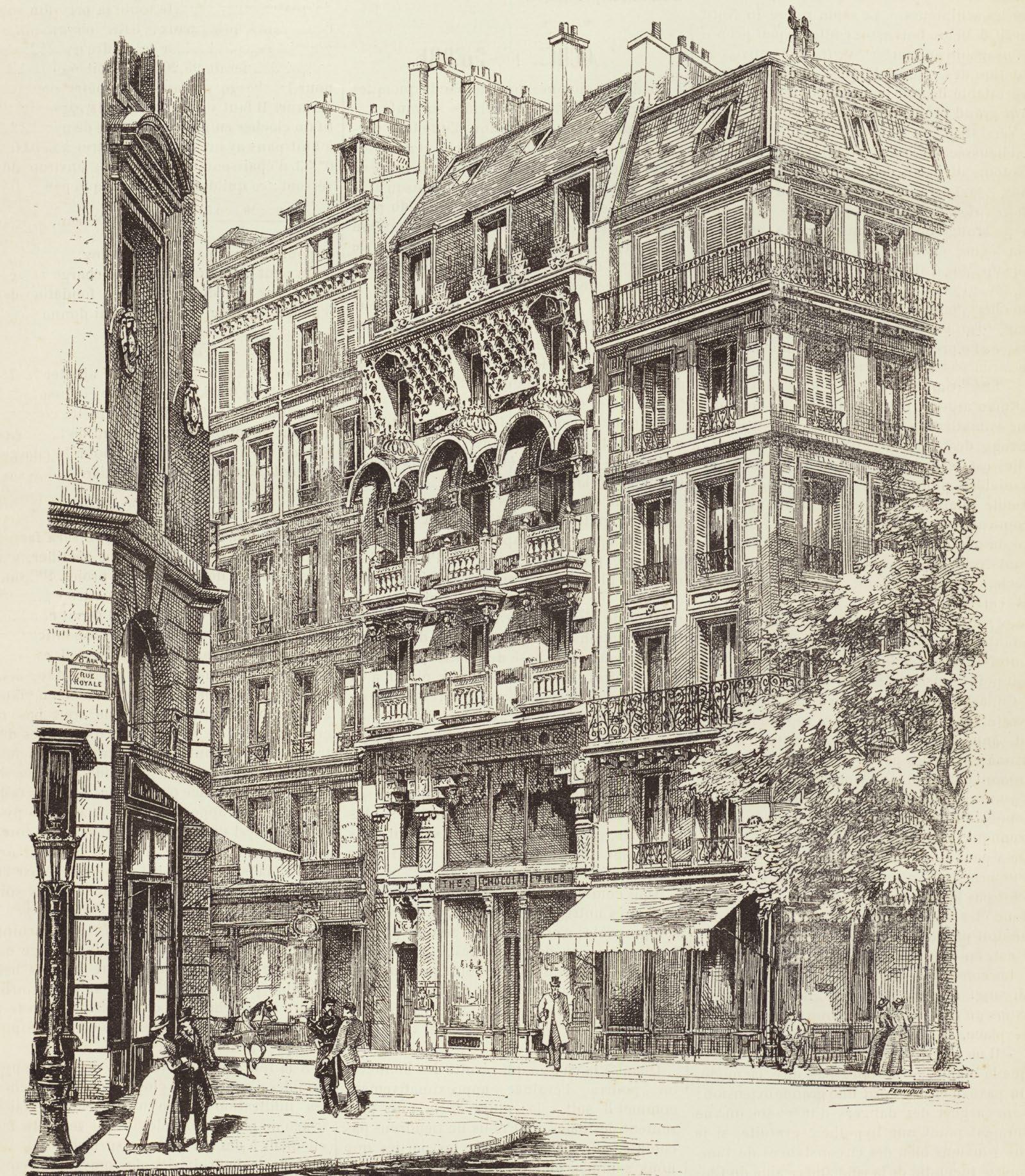 Etching of the building in Rue du Faubourg Saint-Honoré which became the Hermès headquarters in 1880. Illustration for La Semaine des Constructeurs, Huitième Année. France, 1883–1884.
