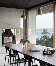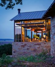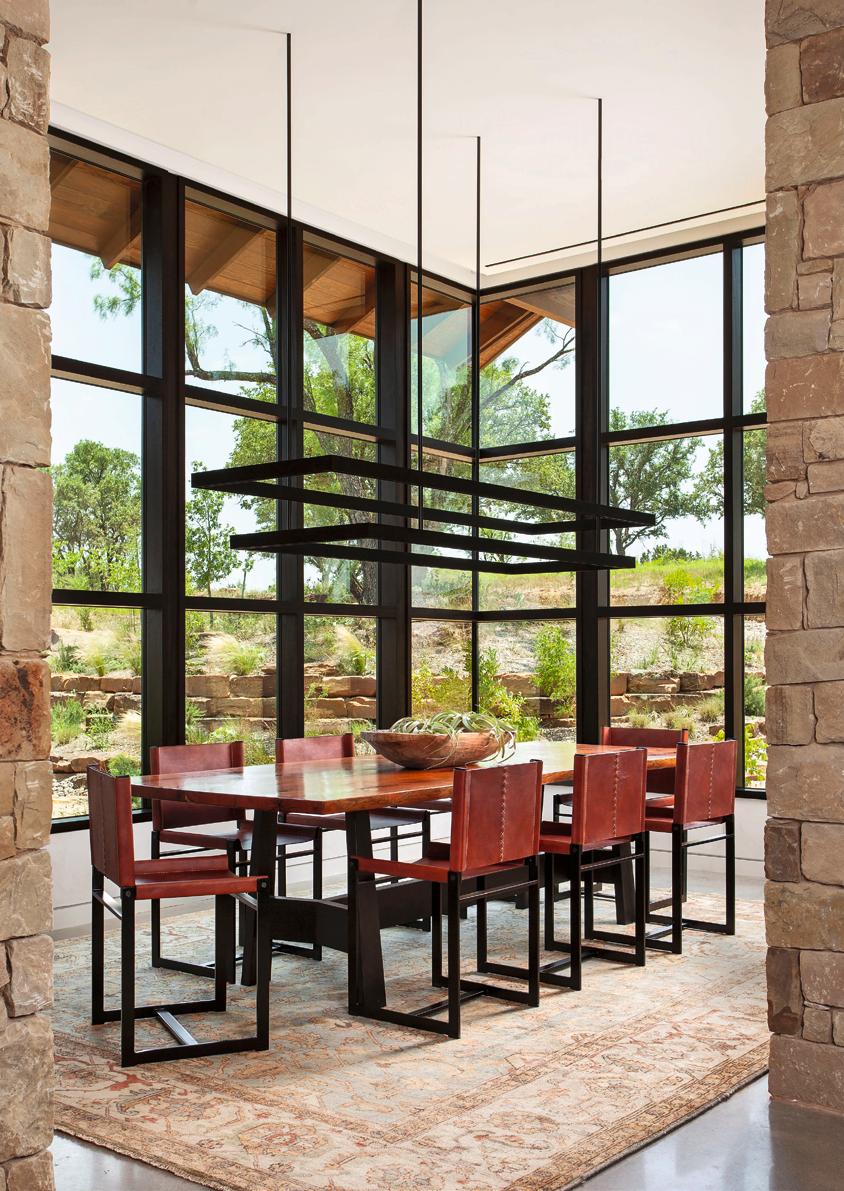 185 The clients spent years scouting their remote 300,000-acre property looking for the perfect location to build their new home. Finally, they located the approximate site to take advantage of a field of boulders on the hillside with distant views of rural fields and the hill country beyond. The idea was to be able to take in the views while also taking advantage of prevailing breezes and comfortable outdoor living. The design brief was a contemporary ranch aesthetic that was functional. The 5,000-square-foot (465-square-meter) home features modern, clean lined, low-maintenance ranch design with luxury comfort. The connection to the land was paramount to the homeowners. Large glass wall openings and a large, fully operable window wall in the living room allow for an abundance of natural light, sweeping breezes, and vast vistas of the ranchland beyond. Natural, simple, and pure materials were used for the interior design. Wood, stone, plaster, steel, and concrete were incorporated to create transparency in material and form so as not to compete with the landscape’s rugged beauty. Gathering outdoors is an integral element of entertaining in the home. With plenty of space for family and friends, the outdoor covered porch boasts a seating area with a custom fire feature and a double television for indoor/ outdoor viewing. The outdoor dining area connects to a bar with a large pass-through window. There are multiple covered outdoor spaces, including a dogtrot between two guest suites, creating an intermediate place to enjoy the breezes while being shaded by the large roof overhead.