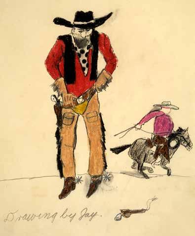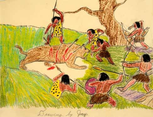 Another early crayoned drama shows prehistoric tribal hunters wearing leopard skins attacking a sabertooth cat. “I don’t know what inspired that particular scene,” Jay says, “but it’s going to be bad for the feline.” The tribal hunters were imagined through the trope of Hollywood Tarzan movies.