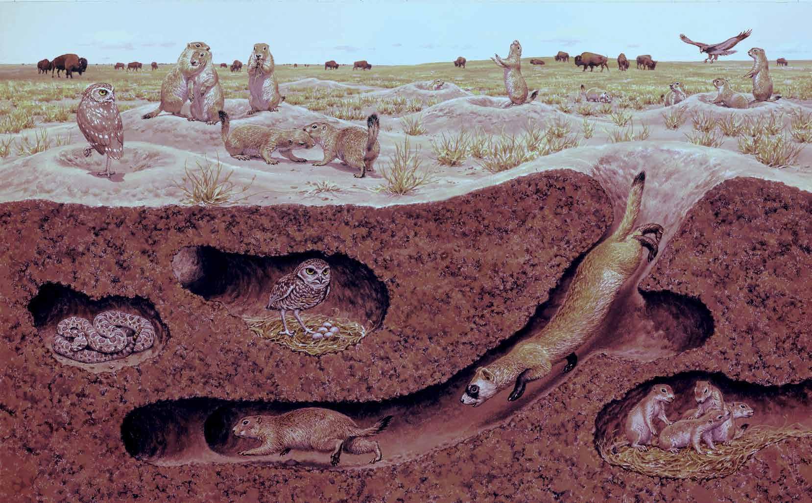 A black-footed ferret hunts prairie dogs in their burrows, but is often outmaneuvered in their labyrinth of escape tunnels. Burrowing owls nest underground to avoid terrestrial predators, but prairie dogs and rattlesnakes often discover eggs and hatchlings underground.