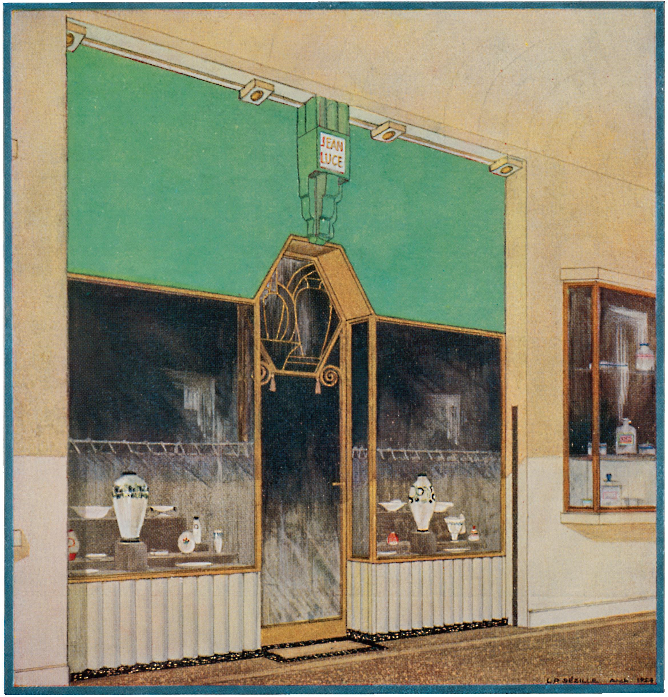 À la fois objet décoratif et utilitaire, produit industriel et objet de consommation, le service de table a sa place légitime au sein de l’Exposition internationale des arts décoratifs, qui vise à représenter, sous le seul signe de la modernité l’art, l’industrie et le commerce, dont l’union doit permettre l’application et la diffusion de l’art dans les objets de la vie de tous. Attachées au groupement « Accessoire du mobilier », la céramique et la verrerie se trouvent dans pratiquement tous les grands pavillons de décorateurs comme élément complémentaire de l’ameublement. À l’intérieur du Grand Palais, six secteurs sont spécifiquement consacrés à la céramique et à la verrerie présentées par des décorateurs, des grands magasins, des maisons d’édition et des manufactures. Hormis la Manufacture nationale de Sèvres et celle de Baccarat (en association avec la maison Christofle), qui possèdent leurs propres pavillons de prestige, les autres manufactures se regroupent dans des pavillons régionaux. Celui de Limoges, nommé « VIIe région économique », est sans surprise le plus notable en matière de porcelaine1. Mis à part le maître René Lalique, qui dispose de son propre pavillon sur l’esplanade, Jean Luce est le seul à posséder un stand autonome parmi les indépendants. Sa boutique éphémère, dotée d’une devanture sobre et raffinée, est érigée par l’architecte Louis-Pierre Sézille dans la galerie des Boutiques, sur la terrasse de la gare de l’esplanade des Invalides (g 57, 58). En dehors de sa galerie et du Grand Palais, ses pièces sont exposées dans de multiples lieux (g 59)2. Les œuvres de Goupy ont une visibilité comparable à celles de Luce : elles sont principalement présentées au Grand Palais, dans le pavillon de la maison Rouard coédifié avec la revue Art et Décoration et dans le prestigieux pavillon Musée d’Art contemporain de Süe et Mare3