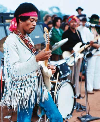 songs and an amazing rendition of the “Star Spangled Banner,” which later became part of history thanks to Michael Wadleigh’s famous documentary about the Woodstock Festival. Hendrix’s interpretation was a veritable explosion of sounds—howls, groans, whistles, screams, shouts, blows, bangs, knocks, squeaks, scrapes and rumbles—an incredible version of the American national anthem that also featured the sound of bombs exploding (a reference to the Vietnam War). Even though no lyrics were sung, Hendrix’s version of the national anthem became an important pacificist song. This not only helped put Hendrix’s indelible stamp on the Woodstock Festival, it also became one of the defining moments of the 60s, which were about to end. “We washed and drank / in God’s tears of joy / And for once. . . and for everyone. . . / The truth was not a mystery,” wrote Hendrix in a poem about the event.