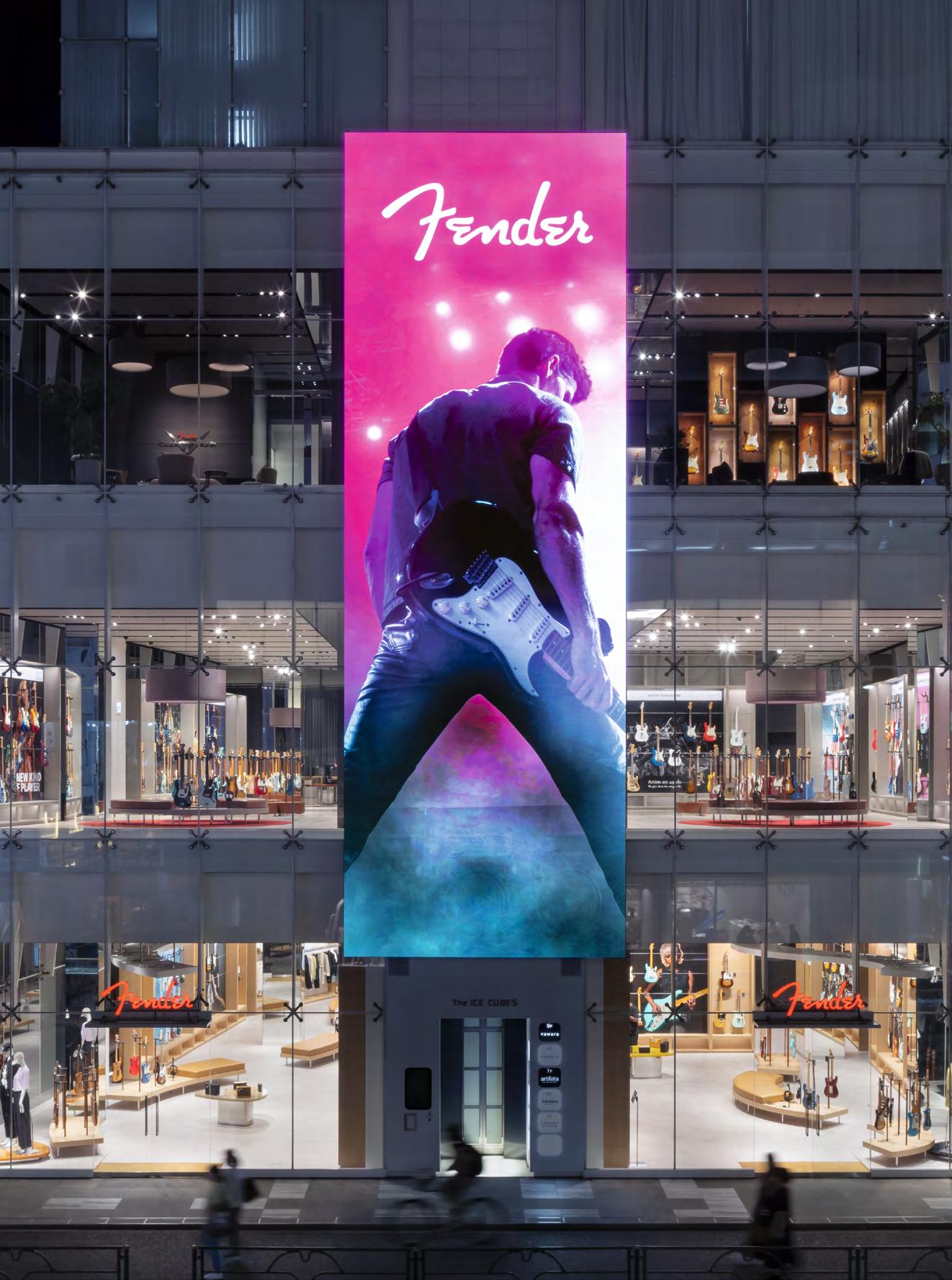 One final and dramatic detail adds to the Fender Flagship Tokyo experience: a huge central, vertical LED display on the exterior façade shows clips of celebrities with their guitars to passersby.
