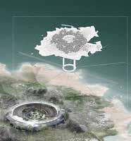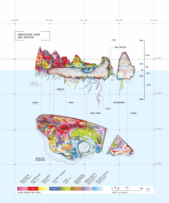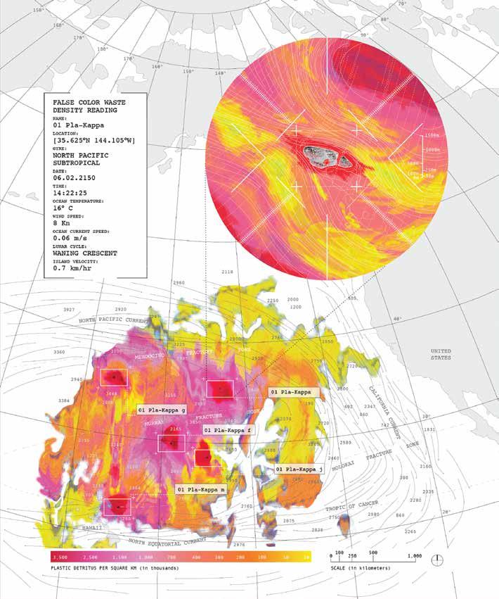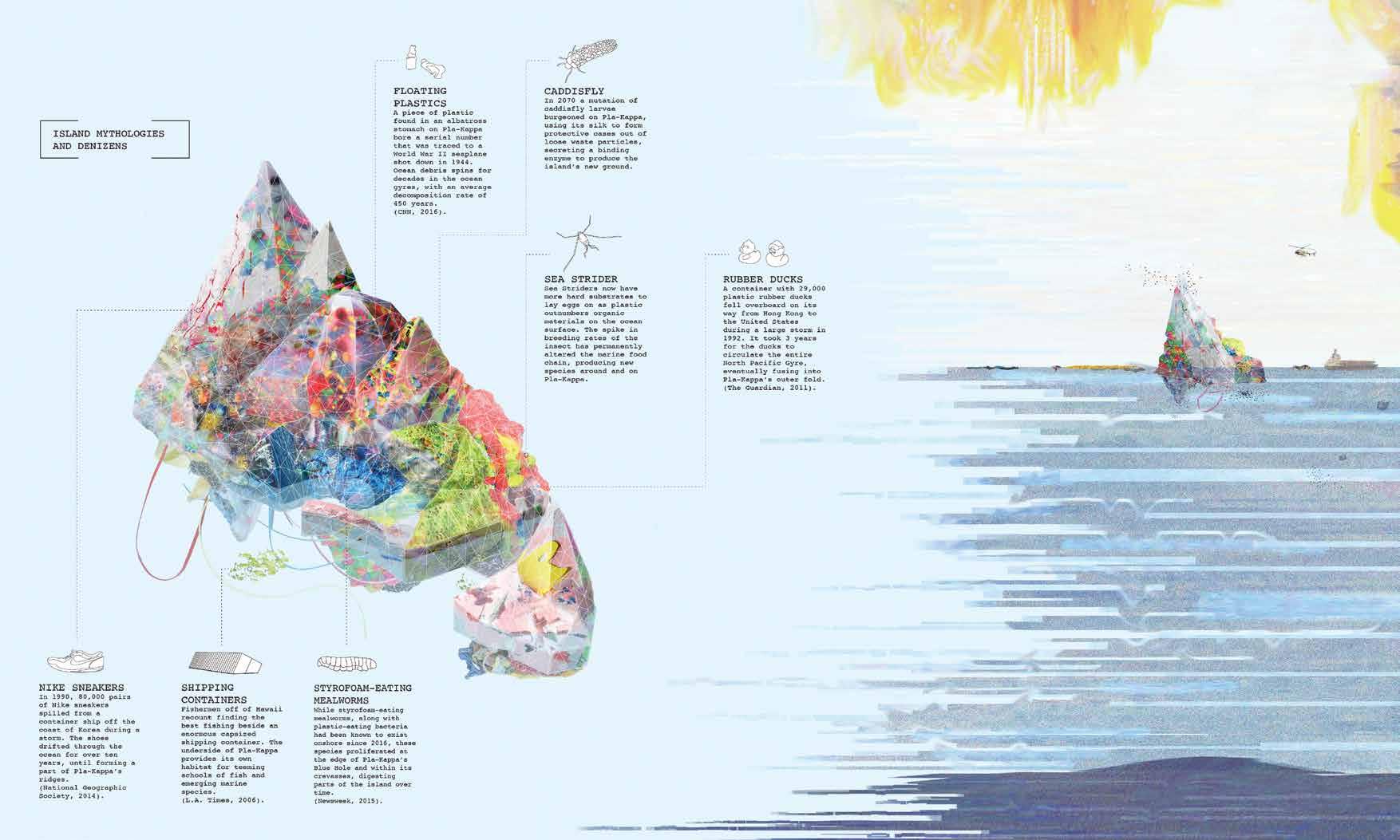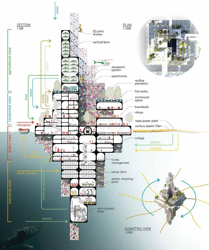 While growing, the island passes by all continents, connecting regions of poverty and despair with regions of wealth and prosperity. It collects its inhabitants from the army of forgotten and dispossessed who are stuck in between. Buried deep below the surface in the belly of the island lie the servers which contain the squirreled-away fortunes of the worldâs richest and greediest. Positioned in international waters, the United Plastic Nation is bound by no national laws, thus enabling it to function as a tax haven and generate revenue. The United Plastic Nation questions the concept of the nation state, which defines itself by exclusion of the outside via borders and citizenship. This island is instead, by default, inclusive; it has no borders, is part of all continents, and anyone can be become citizen. A society of true urban nomads is born, not moving from city to city but moving their city themselves.