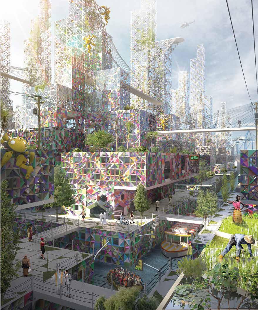 Wars, poverty, environmental destruction â sounds like a recipe for Armageddon. What if we could take greed, ignorance, and violence and create something positive? The United Plastic Nation is the antipode â an ever-growing structure, floating through the ocean currents, slowly turning circles around the globe, feeding off a seemingly endless resource: our drive for self-destruction. On its way, it collects and recycles plastic from the oceans. Building material is produced, which is then 3D-printed by a swarm of robotic drones. Layer by layer, they build a completely self-sufficient city. Food is grown in vertical aquaponic farms, water and waste cycle through closed systems, and energy is produced by the waves. The island grows both horizontally and vertically along a New York-like grid, forming an unsinkable iceberg structure. Eventually a landmass of one square kilometer emerges with residential, industrial, recreational, and commercial zones â the first district of the United Plastic Nation.