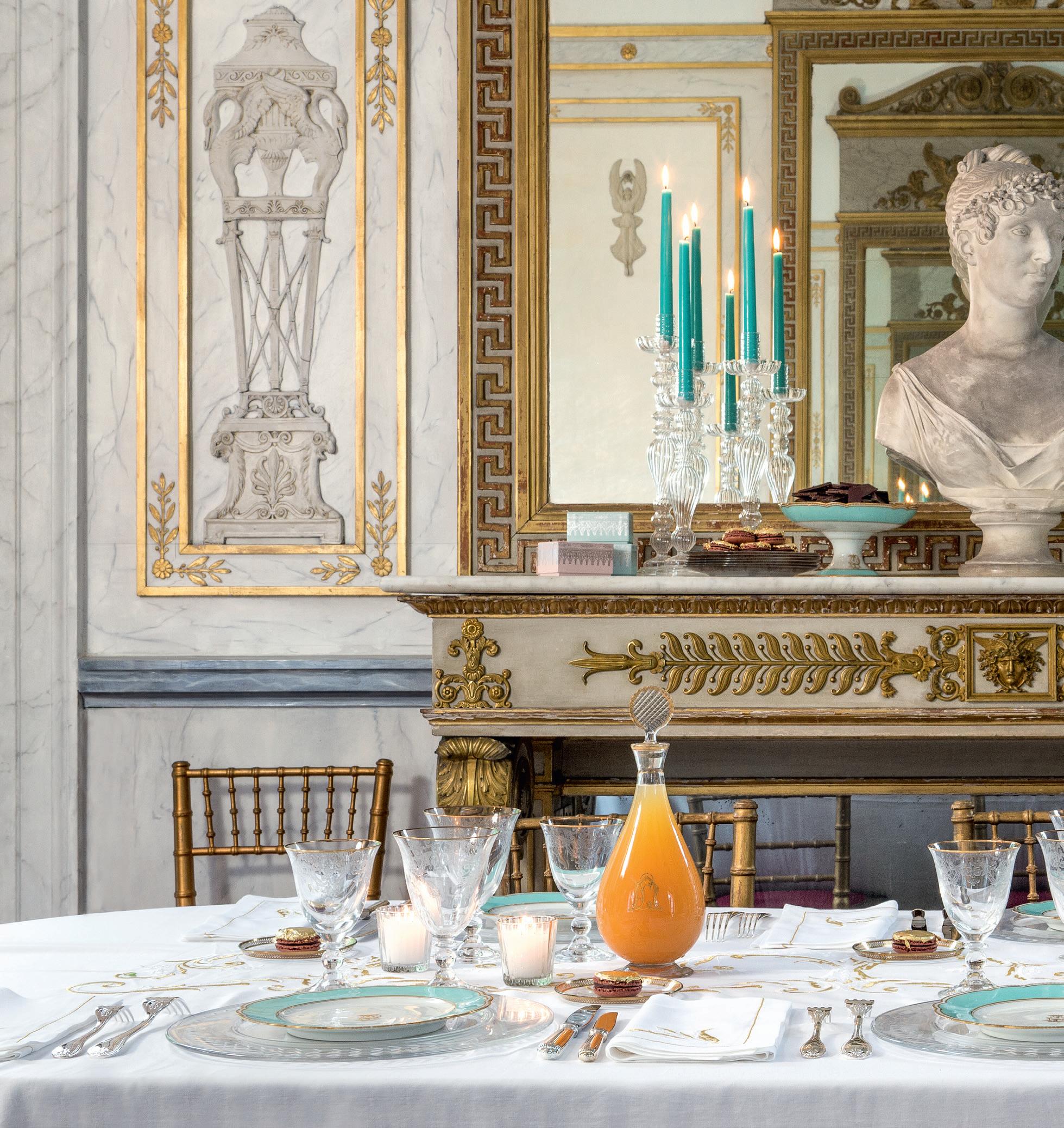 •• For the final touch, and just before serving, lightly pass a moistened pastry brush over the surface of one shell of a macaron and carefully apply an edible gold leaf. Repeat for the remaining macarons.