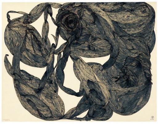 Her drawings, executed in blue or black ink and distinguished by great density and poetics, conceal a degree of mystery that this exhibition and accompanying publication –curated by Anic Zanzi, curator at the Collection de l’Art Brut – aim to reveal, for which I am deeply grateful.