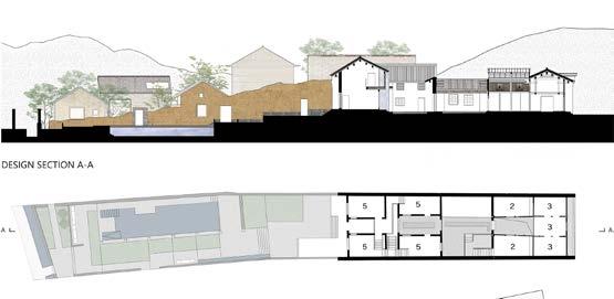 Fig. 7.16. Design. Longitudinal section and plan of the first floor of the radial strip of Dang Courtyard house.