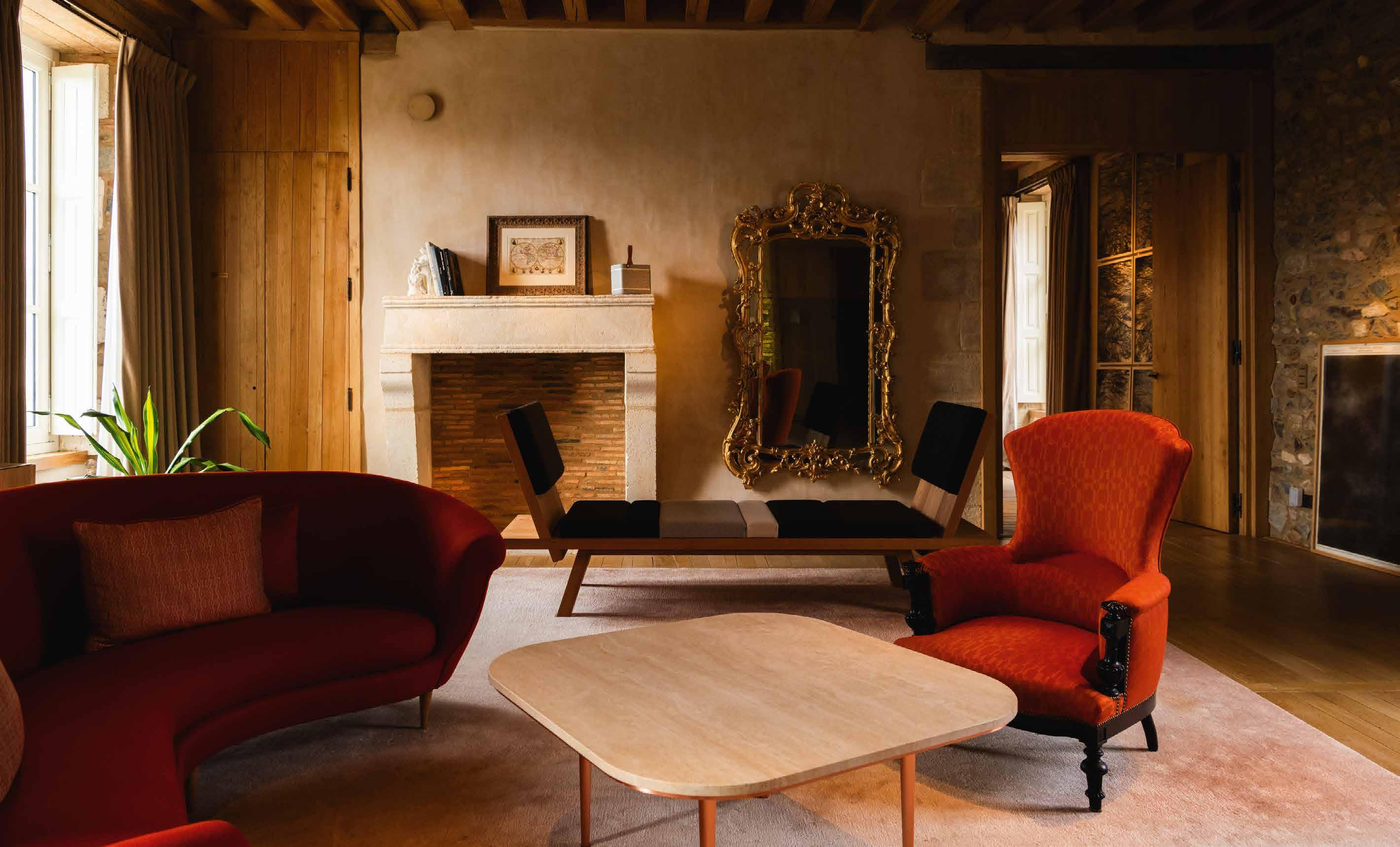 You’ll marvel at the stone gatehouses at the entrance to the property, then set foot on the edge of an ancient crater formed by the impact of a meteorite. Opposite stands a medieval château. To the right, outbuildings stretch under the blue sky. To the left lies the first pond surrounded by works of art. Beyond that are a series of cosy farm houses surrounded by water. One can guess that this place, remodelled by its owner Garance Primat, has lived a thousand lives before welcoming you.