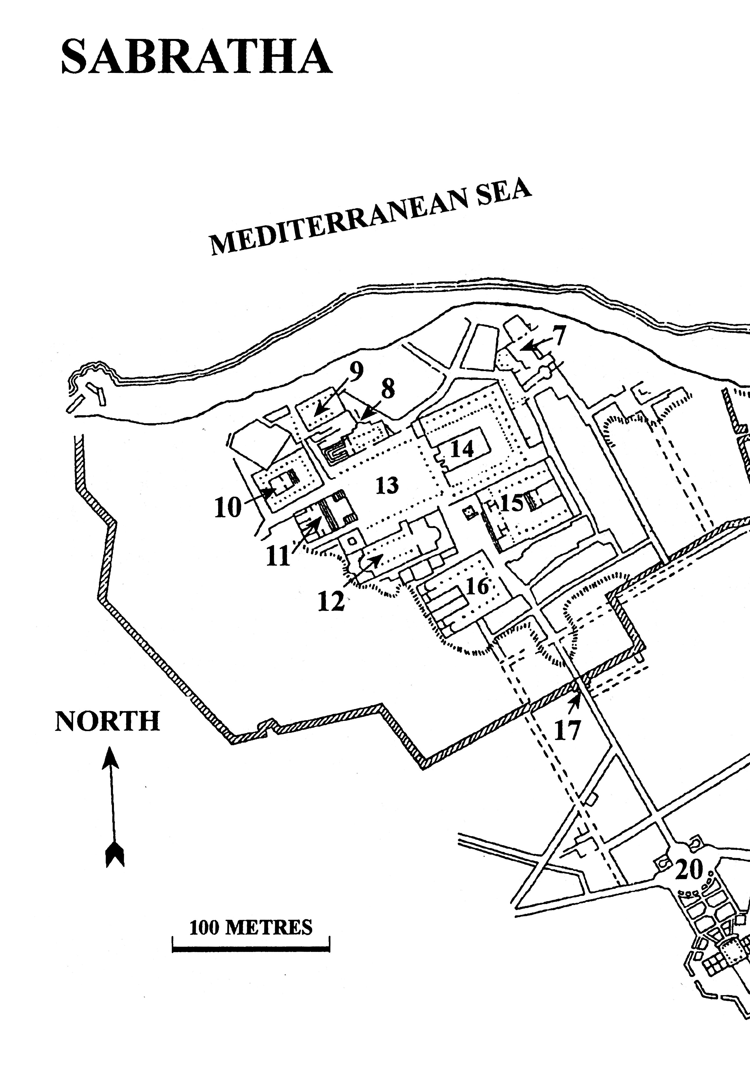 There was an early Phoenician settlement in Sabratha which was later turned into a Roman city towards the end of the first century bc. The Forum, with its temples to the oriental gods Liber Pater and Serapis, contained some of the early buildings. In the second half of the second century ad, a new urban district developed beside the sea to the east of the existing city. This area was laid out via a rectangular plan from the sea front to the theatre, with an important road crossing the district at right angles. A local sandstone was used, but it was so friable that stucco was needed to protect it from erosion, and to take the finer carving and painted details. Stone and marble were imported for fancier effects, or for refacing buildings when money permitted.