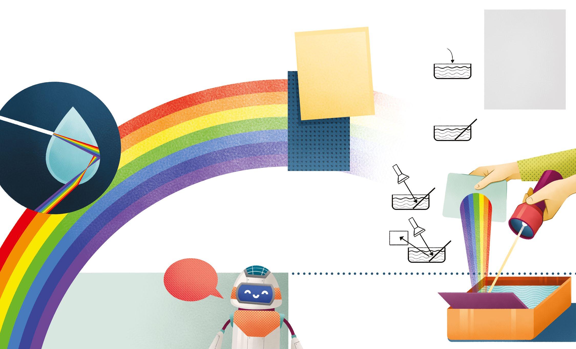 When sunlight encounters a drop of water, a RAINBOW is born. The drop of water acts as a prism; it refracts the rays of light, causing their colors to disperse in a gigantic spectrum.