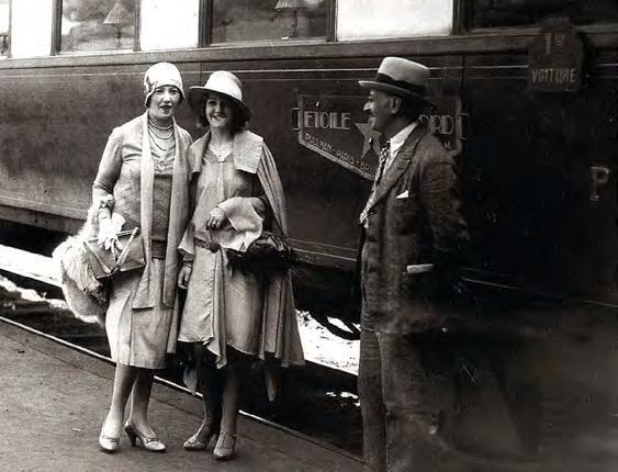 Two women pose in front of the Orient Express in the 1920s.
