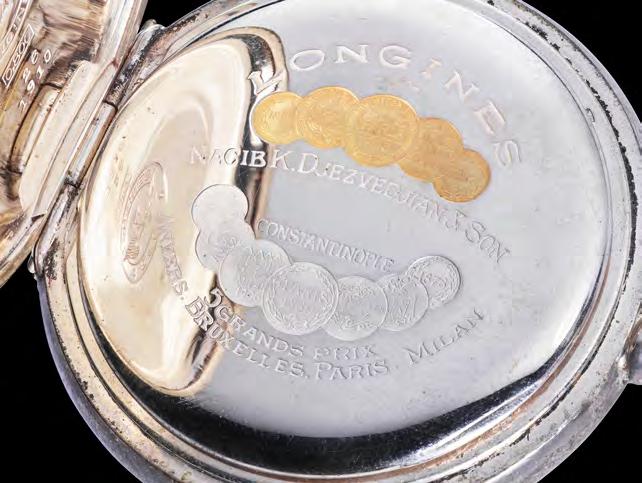 Right: The enamel dial features the name of Longines importer Djezvedjian. The movement is engraved with the winged hourglass, the logo of Longines.