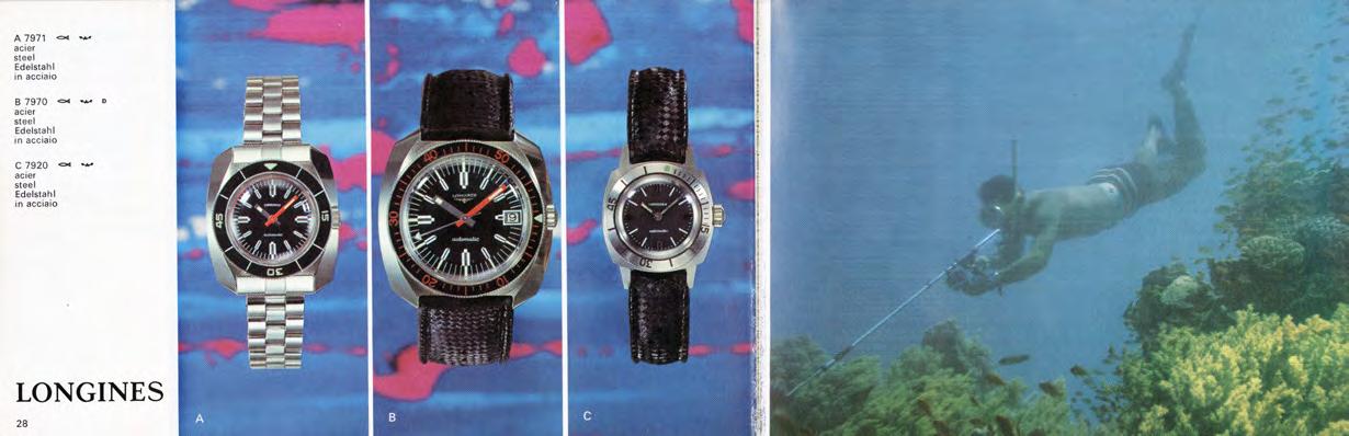The Ultra-Chron presented here is the dive watch version, cataloged as reference 7970. With this model, Longines introduced the worldâs first dive watch with a high-frequency movement. The watch with the 41millimeter stainless steel case is a rarity, as it is from the first series of reference 7970. The sporty watch was invoiced to American importer Longines-Wittnauer Watch Co. on August 22, 1968. It featured a finely knurled, unidirectional rotating bezel with a 60-minute graduation. As befits a dive watch, the minute hand was highlighted in reddish orange to match the indexes of the same color on the bezel. The second hand, in turn, ended in a triangle filled with luminescent material at its tip. Dive watches with high-beat movements remain rare today,