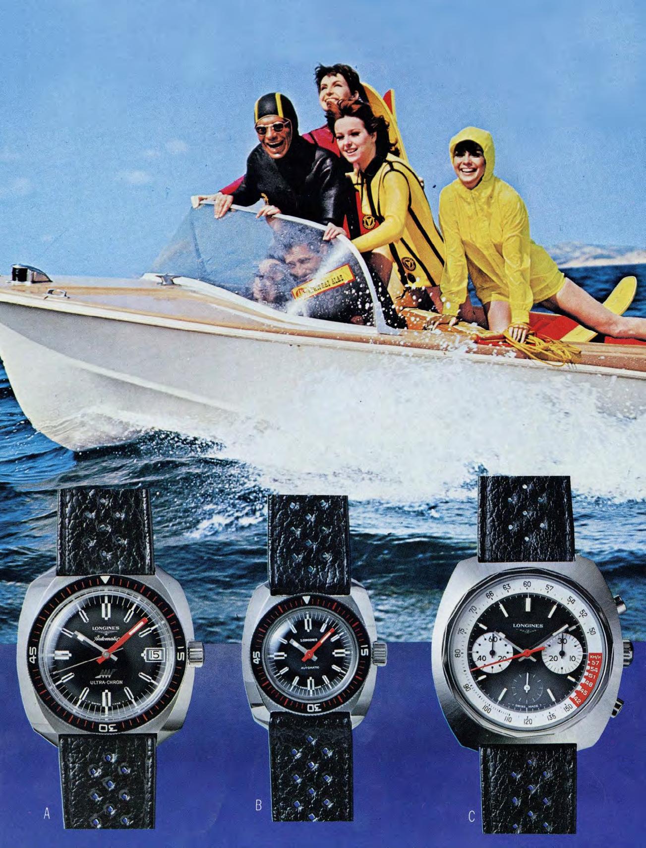 Opposite page: An advertisement from 1969: Water skiing was an up-and-coming sport at the time. Longines also offered the Ultra-Chron as a ladiesâ model and as a waterproof chronograph with a tachymeter scale specifically for water skiing.
