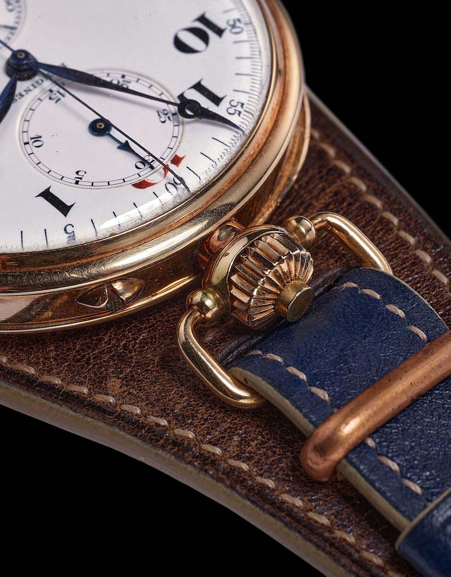 Left side: A rare version of the 19.73N chronograph: Movement produced on May 2, 1912, housed in a 14-karat gold case for the Russian market in January 1917.