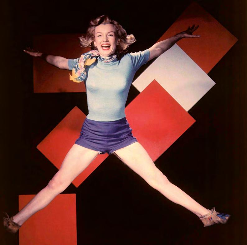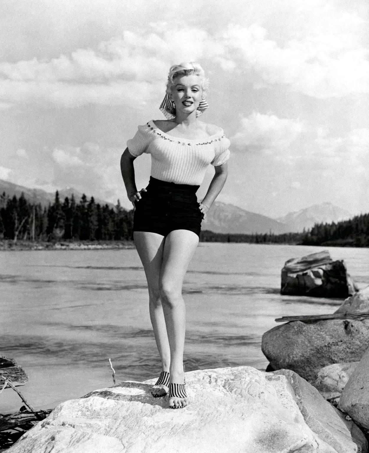 pulled back in a bow. A 1945 shot of her by Dienes wearing a handmade fisherman’s jumper would appear on the cover of the 13 December 1947 issue of the UK’s Picture Post: it was a magazine that regularly attracted over one million readers. Dienes had taken the 19-year-old Norma Jeane on a five-week road trip when she first began modelling and, although he had originally wanted to shoot nudes, the shots he took portray Marilyn in technicolour health, posing in the hearty outdoors dressed in primary colours and cute sporty outfits.