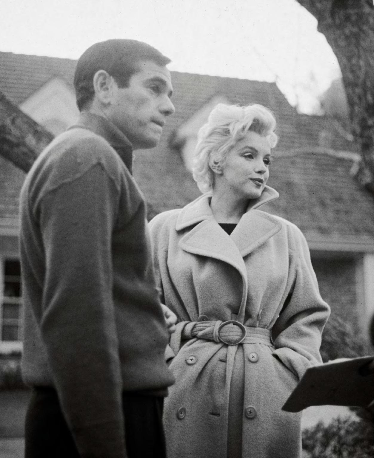 Marilyn with Milton Greene outside her home in California, wearing her Dior camel-wool coat, 1956
