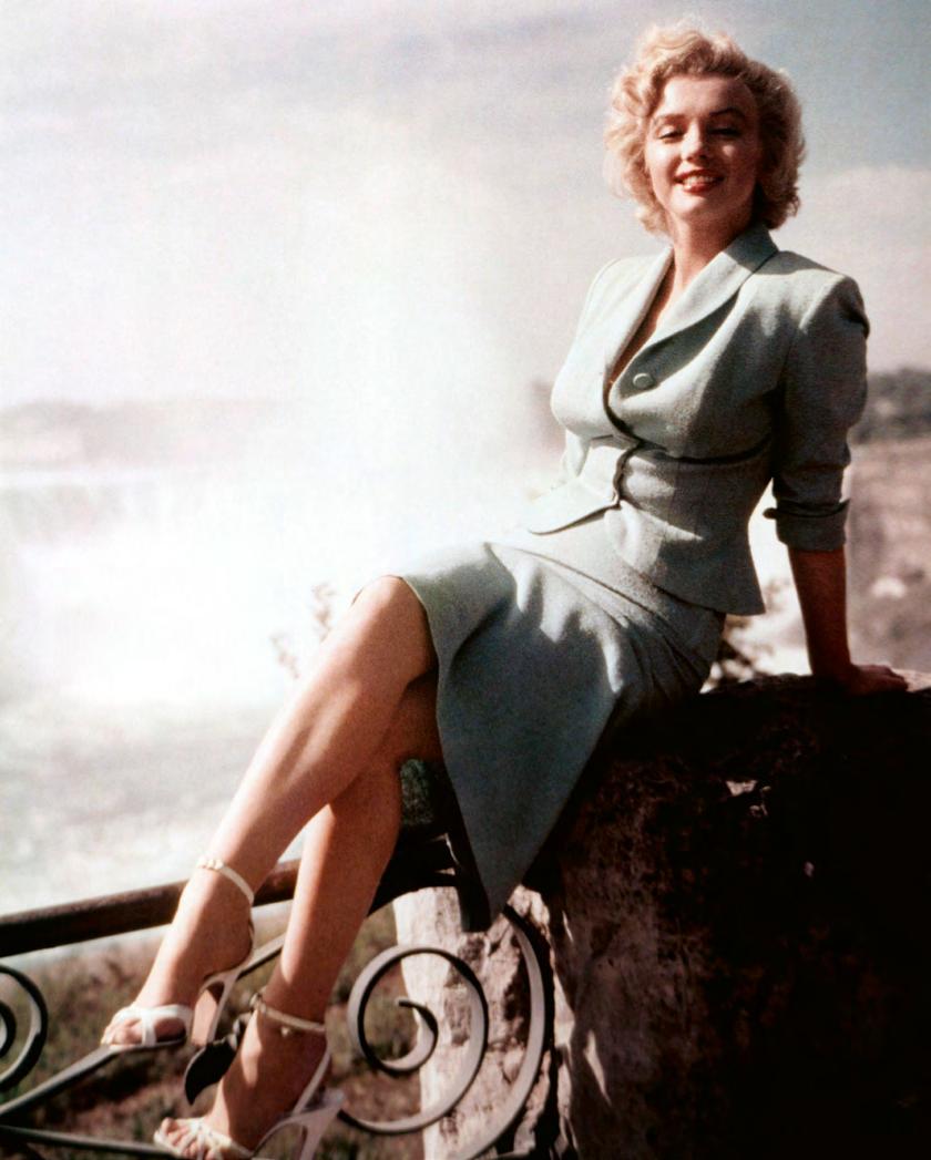Looking fresh and stylish in a pale blue suit, Marilyn poses on the set of Niagara, 1953