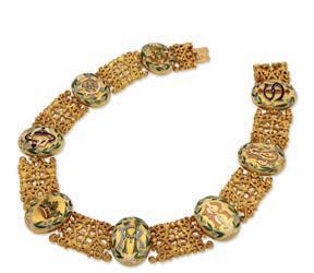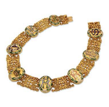 Hancocks London is selling the Spencer-Churchill necklace, comprised of eight 18 carat gold panels, which was commissioned in 1875 by John SpencerChurchill, the 7th Duke of Marlborough, for his wife Frances. The collar includes the initials of seven of their 11 children with the eighth locket displaying a ducal coronet set with tiny gems.