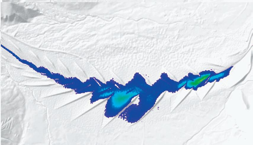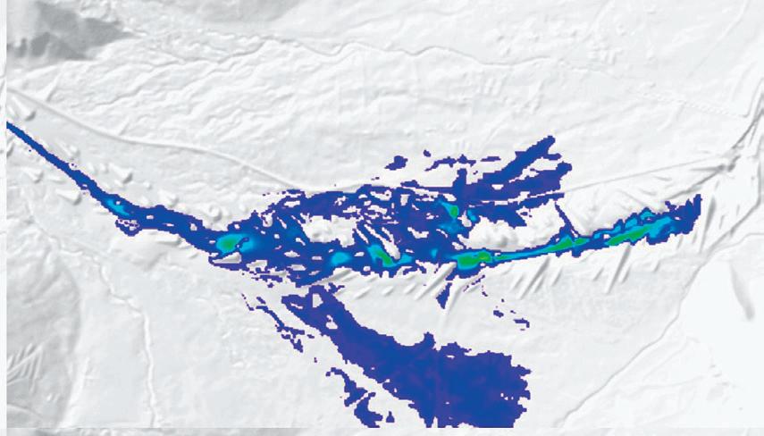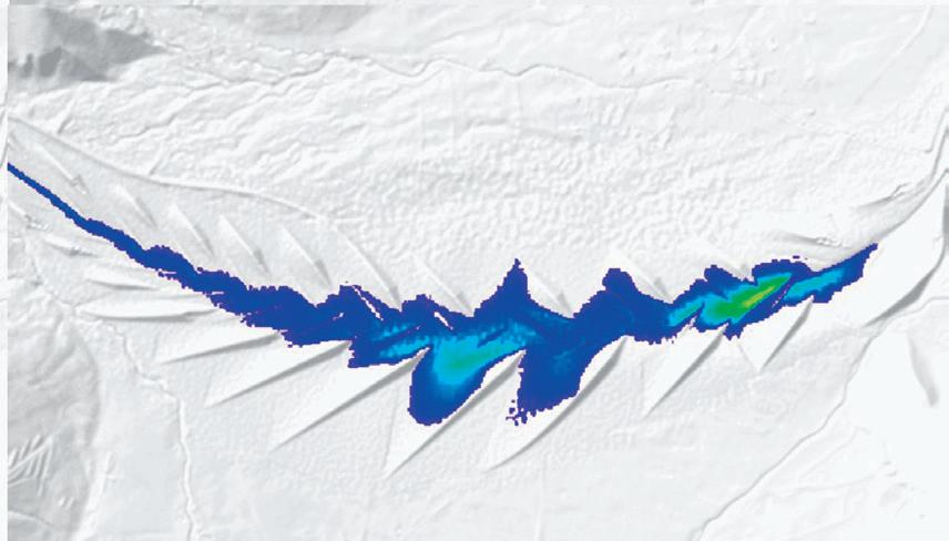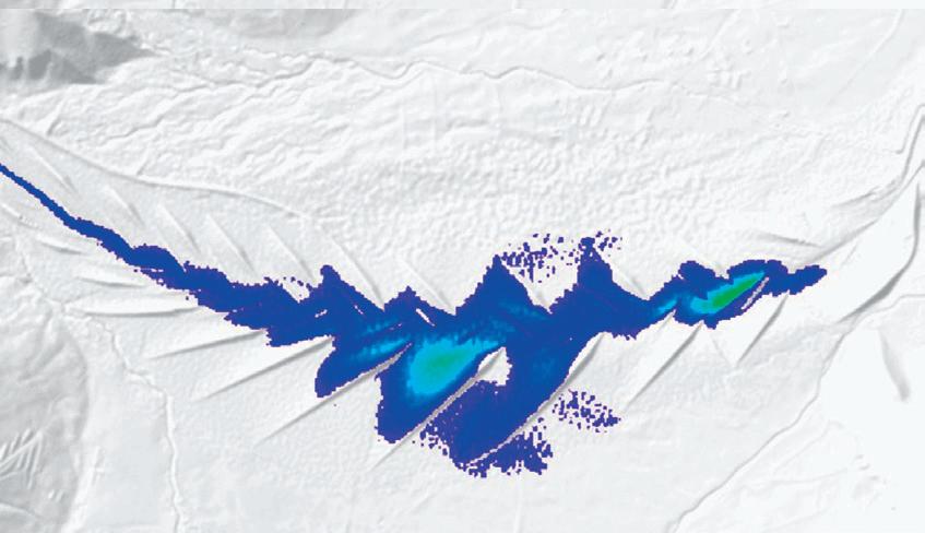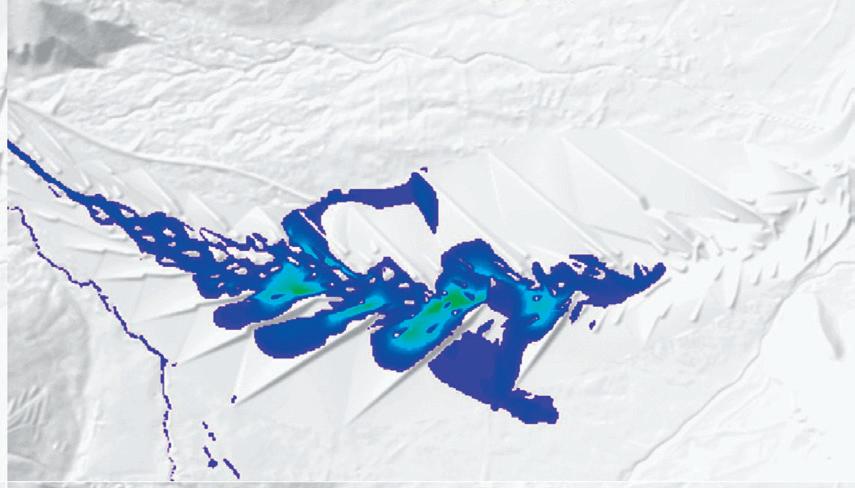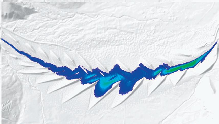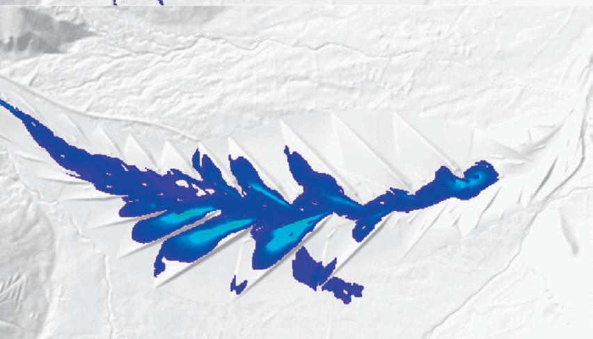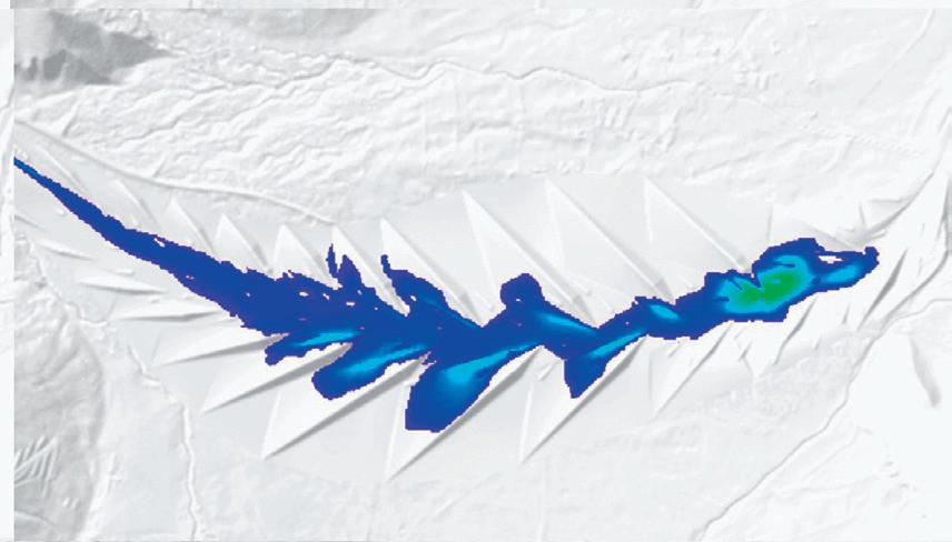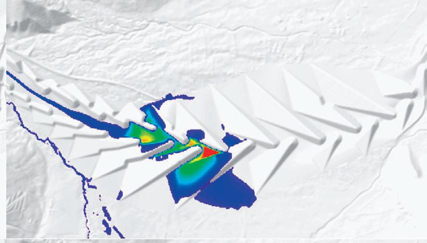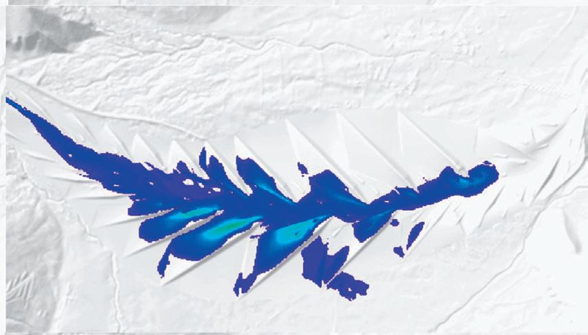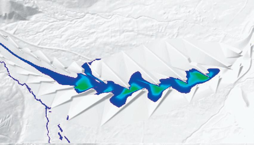Muddy and debris-laden flow simulations throughout the design process highlight a possible scenario after 20 years. The topographic design is continuously adapted using iterative simulations to create a valid landscape structure capable of performing on structural, ecological, cultural, and aesthetic levels. Inputs include volume, flow depth, bed erosion, deposition, speed, and duration.