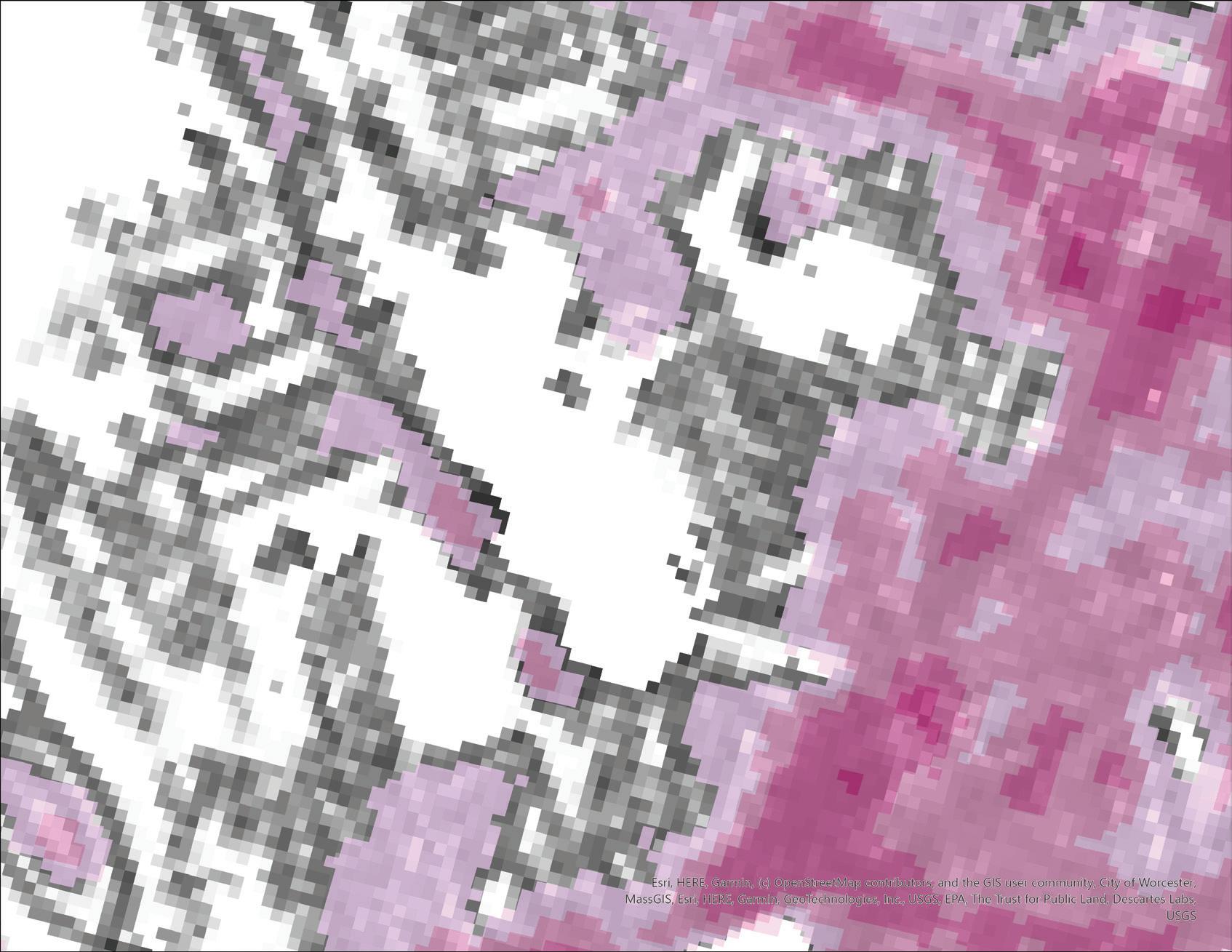 Composite and separate layers of the spatial coincidence of high-probability wastewater discharge, impervious surfaces, heat, and beach closures in Worchester, MA.