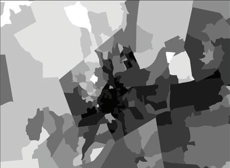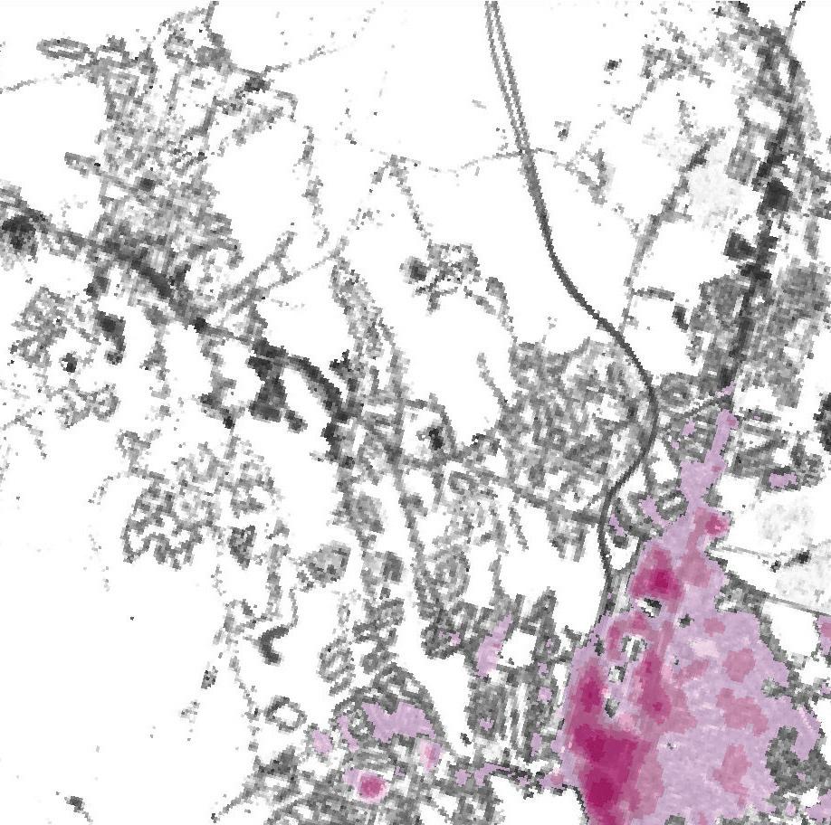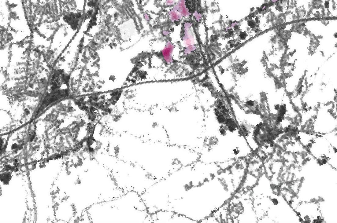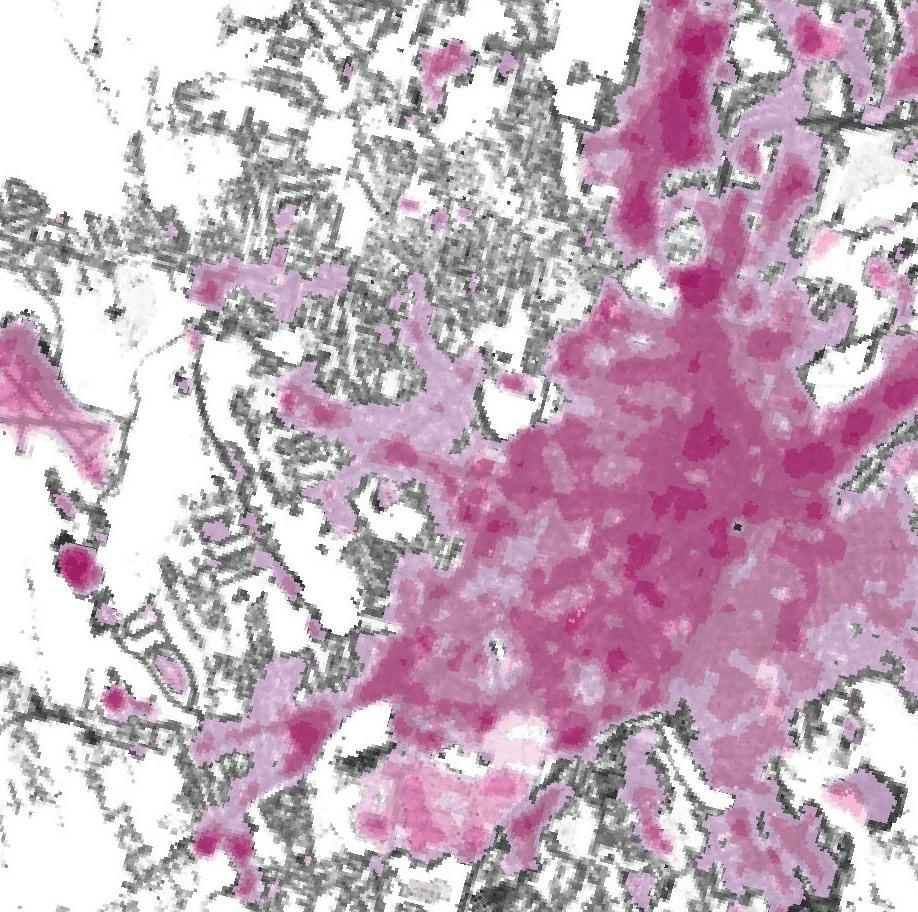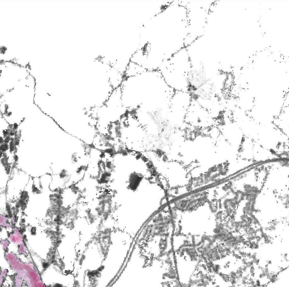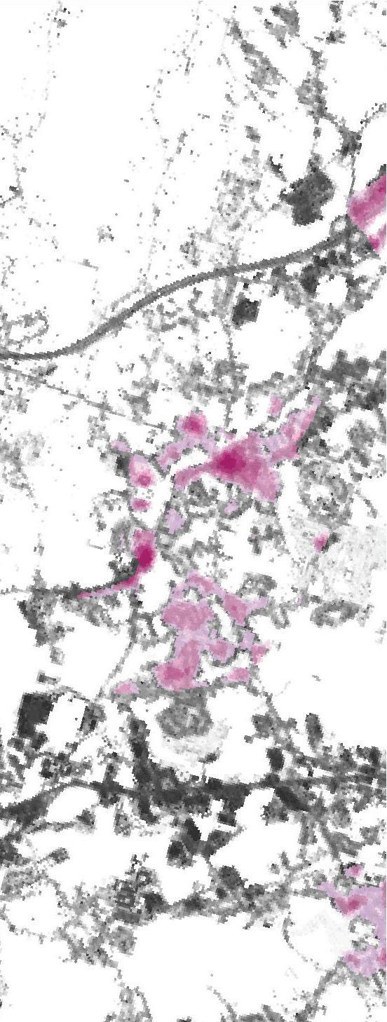 An overlay of Philadelphia’s FEMA maps from 1979 and 2015 (purple dot pattern) shows a 14% reduction in the 100 year floodplain area (light purple tone) despite the population in the combined area increasing by more than 5%. Structures included in the 1979 map are no longer covered by the current 2015 FEMA zones, even though the risk of flooding has grown due to increased storm volatility.