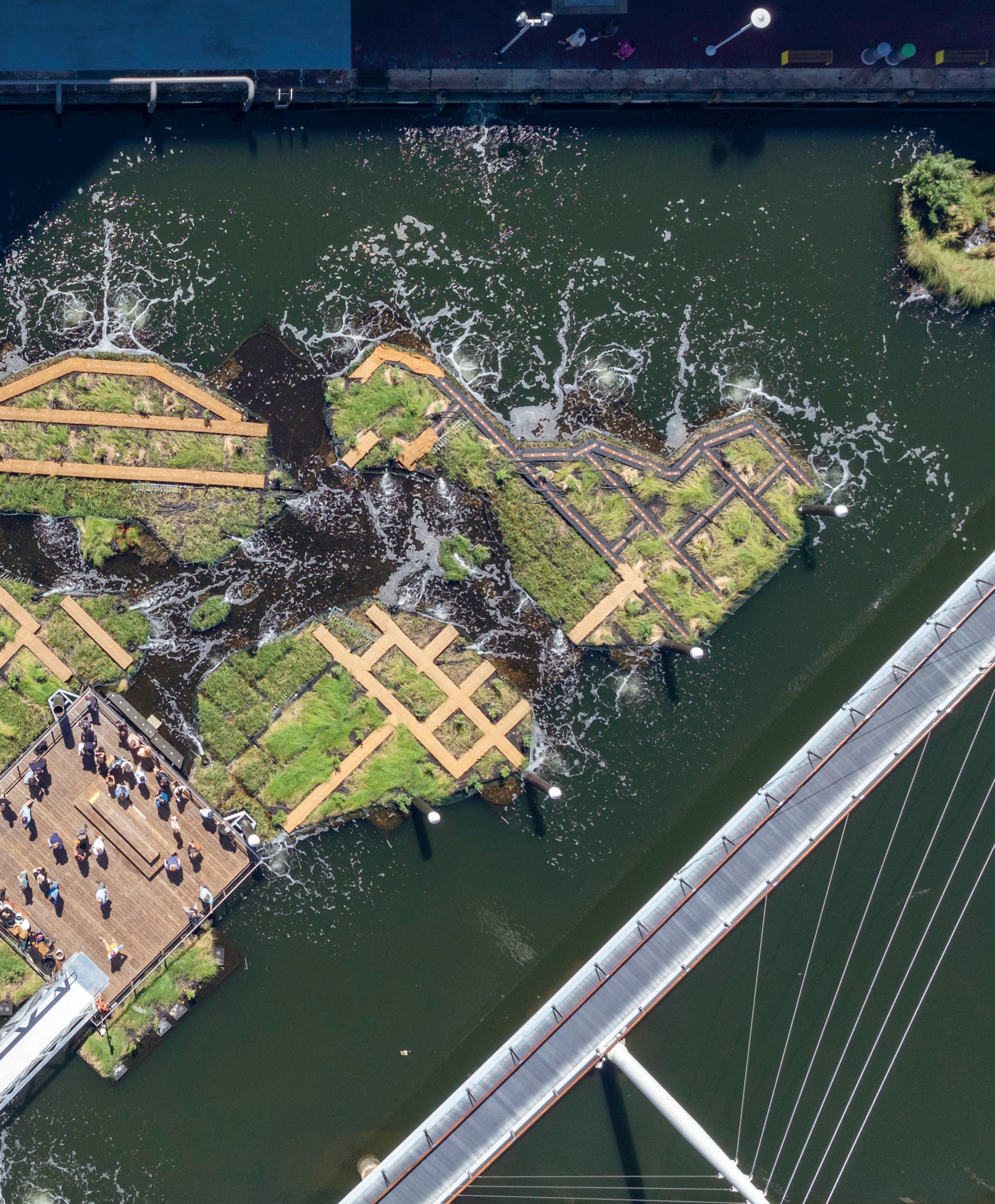 Aerial view of a 930 m2 floating wetland in Baltimore’s Inner Harbor. An advanced hydraulic system helps replicate the function of shallow water flow, which plays a crucial role in water oxygenation and marsh grass aeration.