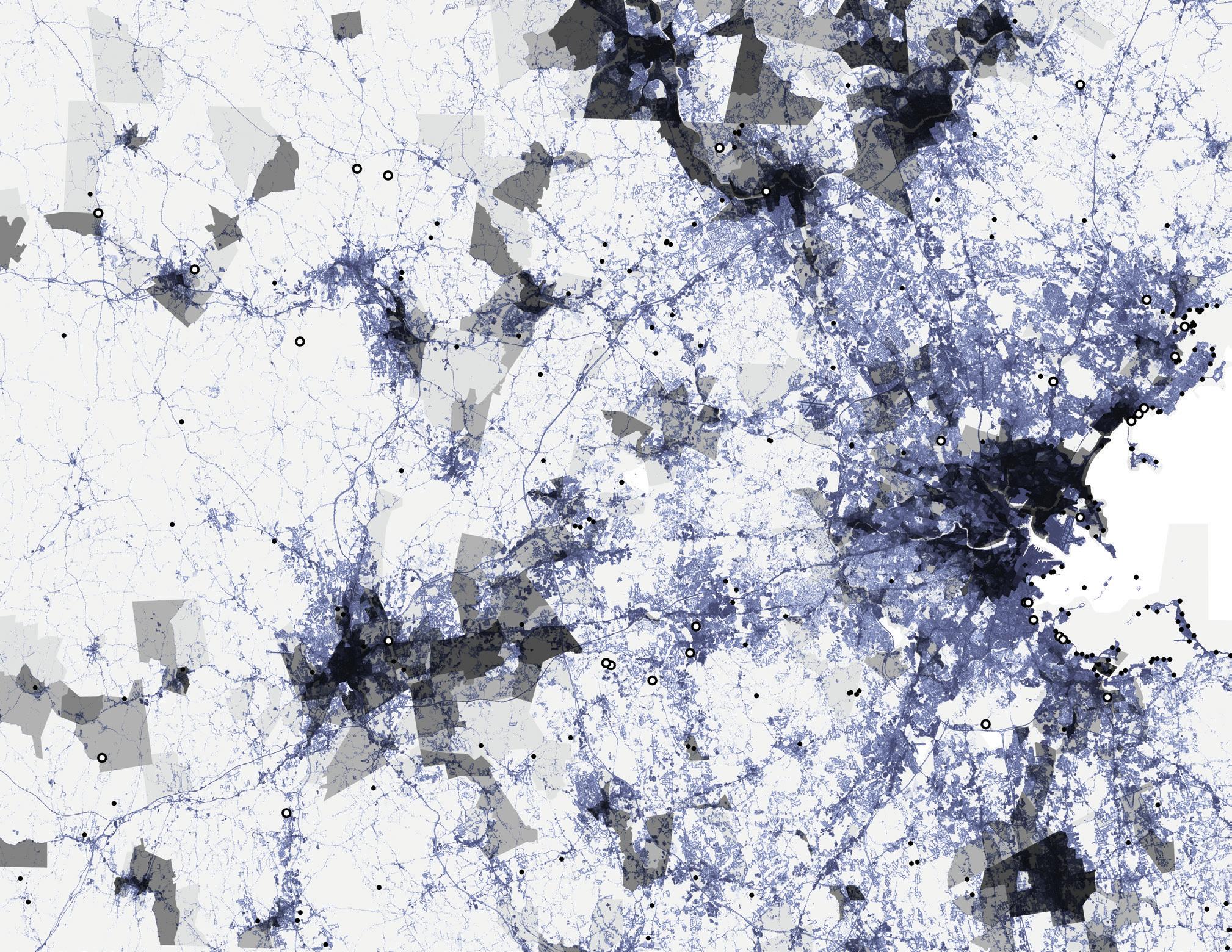 An overlay of Philadelphia’s FEMA maps from 1979 and 2015 (purple dot pattern) shows a 14% reduction in the 100 year floodplain area (light purple tone) despite the population in the combined area increasing by more than 5%. Structures included in the 1979 map are no longer covered by the current 2015 FEMA zones, even though the risk of flooding has grown due to increased storm volatility.