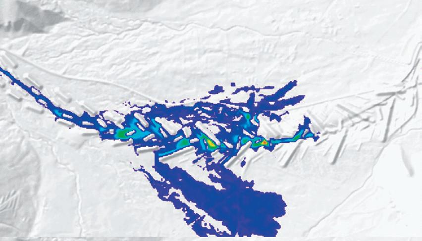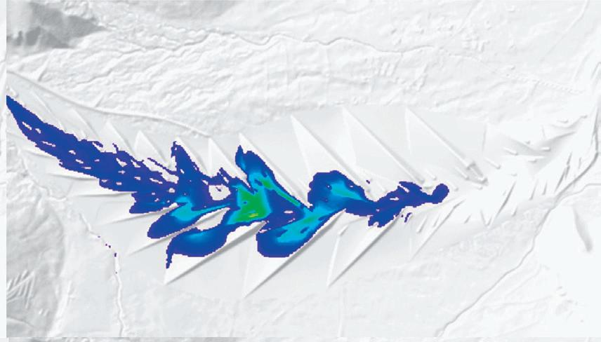 Muddy and debris-laden flow simulations throughout the design process highlight a possible scenario after 20 years. The topographic design is continuously adapted using iterative simulations to create a valid landscape structure capable of performing on structural, ecological, cultural, and aesthetic levels. Inputs include volume, flow depth, bed erosion, deposition, speed, and duration.