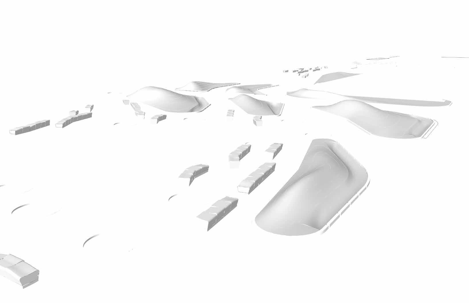 Circulatory flows of people and water amidst cluster of hillocks and seating, opening to large areas for gathering and flexibility. Landscape as teaching tool in an arid climate.
