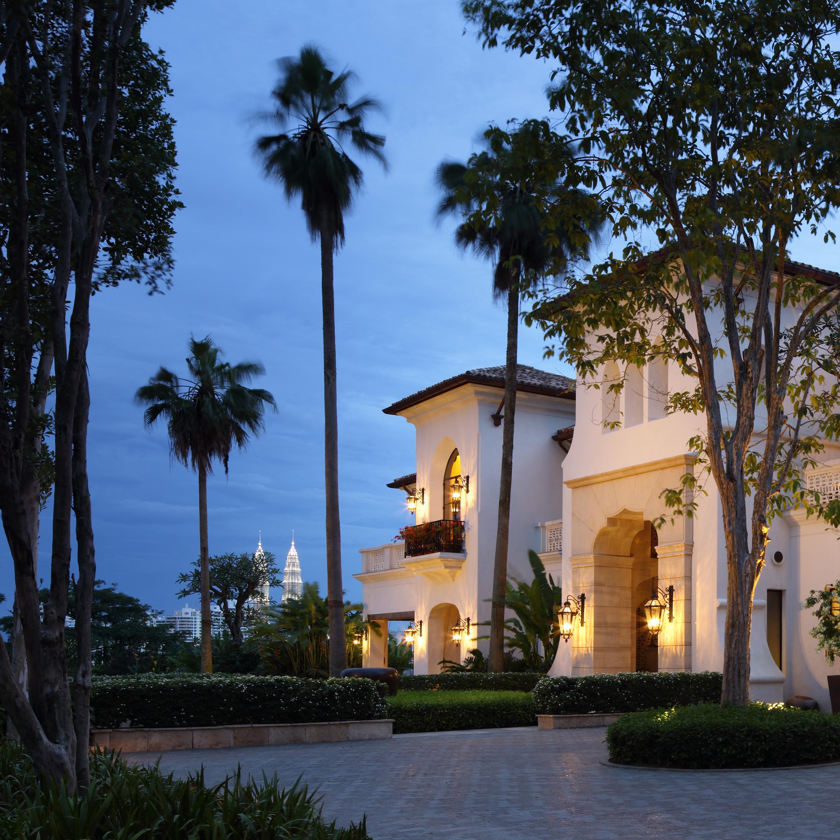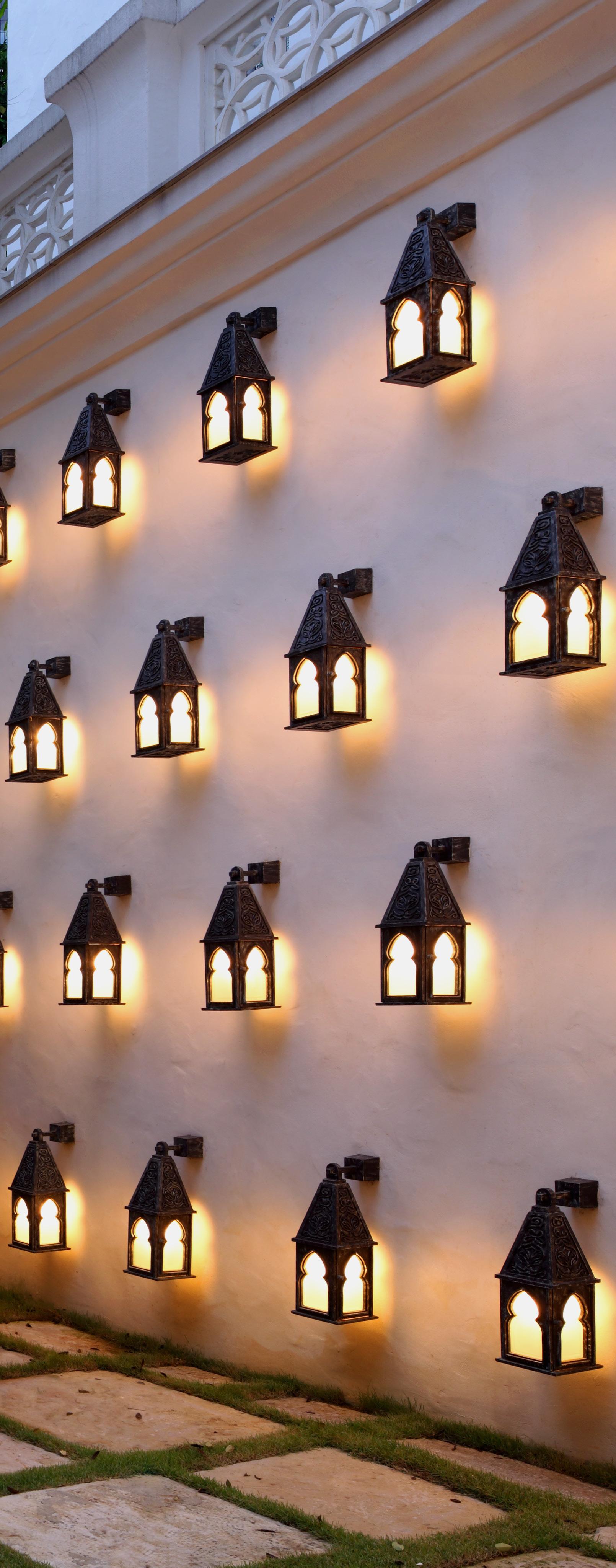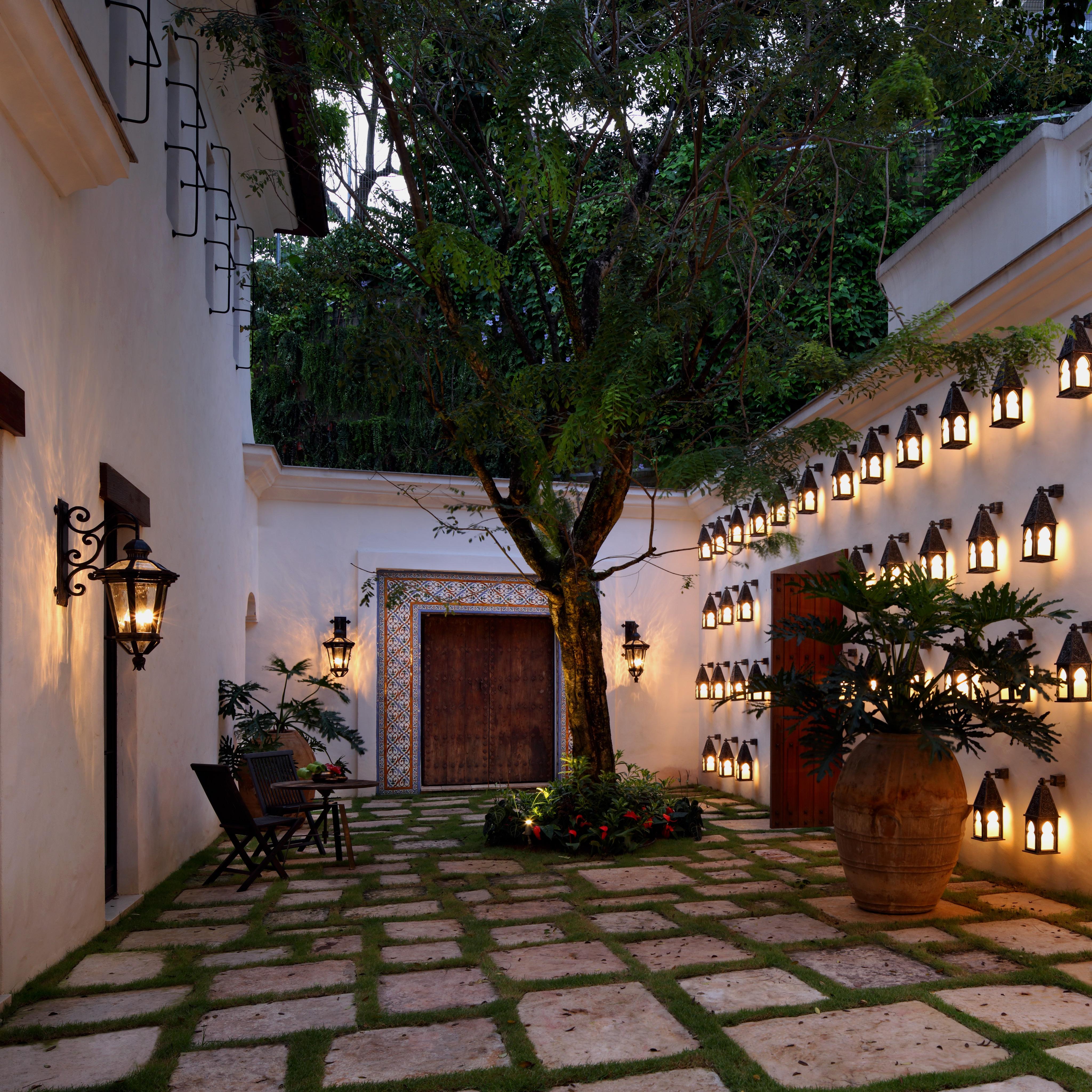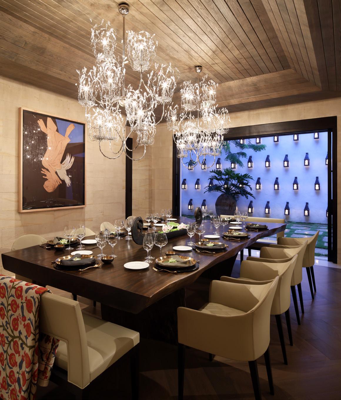 Opening photograph The villa borrows from Andalusian architecture, with a tall entrance and porte-cochère to protect the clients from weather. 01 Reclaimed antique Spanish brick was used for the base of the gatehouse. The exterior walls are smooth plaster and the roofs are antiqued tile. 02 Landry Design Group modeled the lanterns in the courtyard after some the clients had admired on their travels. 03 The dining room opens directly onto the courtyard. An oak tray ceiling offsets a door surround in chengal (a Malaysian hardwood) and limestone walls.