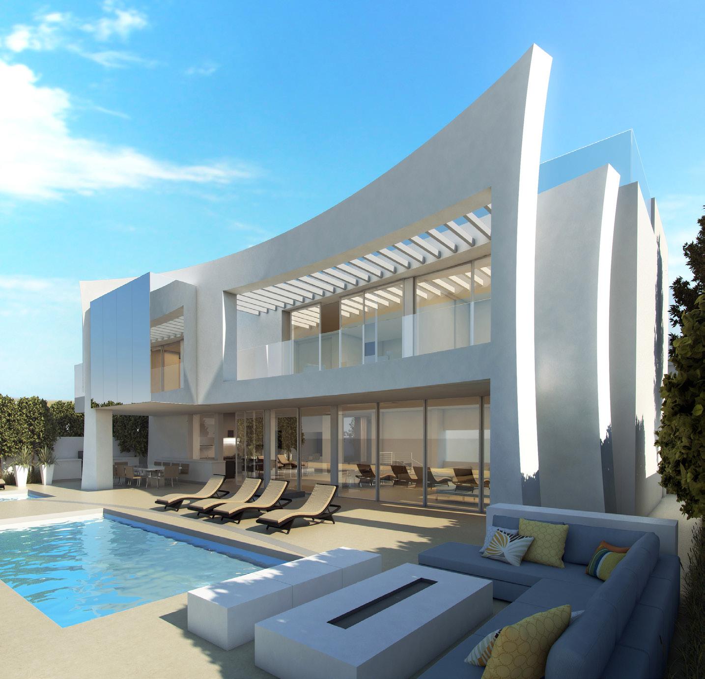 book is the Sea Level Residence in Malibu, which is squeezed onto a tight oceanfront site and yet addresses the Pacific with the same openness with which the Collingwood house embraces the entire city. The same skill for making much out of a smaller footprint is visible in the lovely studio barn on the property of Landry’s Brady-Bündchen Residence II, in Boston, a small wooden structure that manages to combine both serenity and energy, as well as to sit comfortably beside a much larger traditional villa. The ability to work on a confined site brings even more exciting results at the Samson Beach House, also in Malibu, now under construction and presented in the final section of this book, “Works in Progress.” Here, in a composition of curving walls, Landry manages both to be contained and to break free with a real sculptural energy.